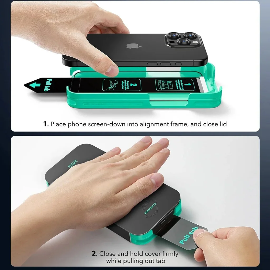 Az ESR Armorite UltraFit képernyővédő egyik legnagyobb előnye a forradalmi telepítési mód. A mellékelt, precíziós UltraFit telepítőkeret biztosítja, hogy a fólia tökéletesen, por- és buborékmentesen illeszkedjen a kijelzőre: