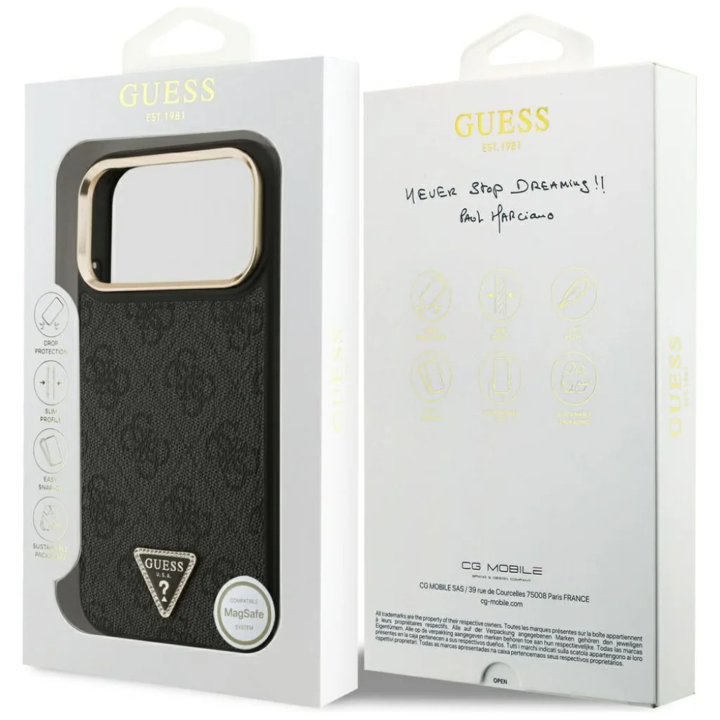 A Guess PU Bőr 4G Strass Triangle Logo Gold Frame hátlap tökéletes kiegészítő telefonjához és megjelenéséhez, amely ötvözi a funkcionalitást és a stílust.
