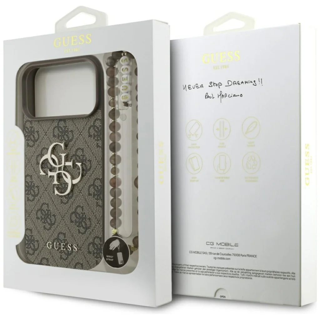 Válassza a Guess 4G klasszikus logós barna tokját, és öltöztesse iPhone 17 Pro Max készülékét elegáns védelembe, amely tökéletesen tükrözi az Ön egyedi stílusát és a Guess márka luxusát. "Never Stop Dreaming!"