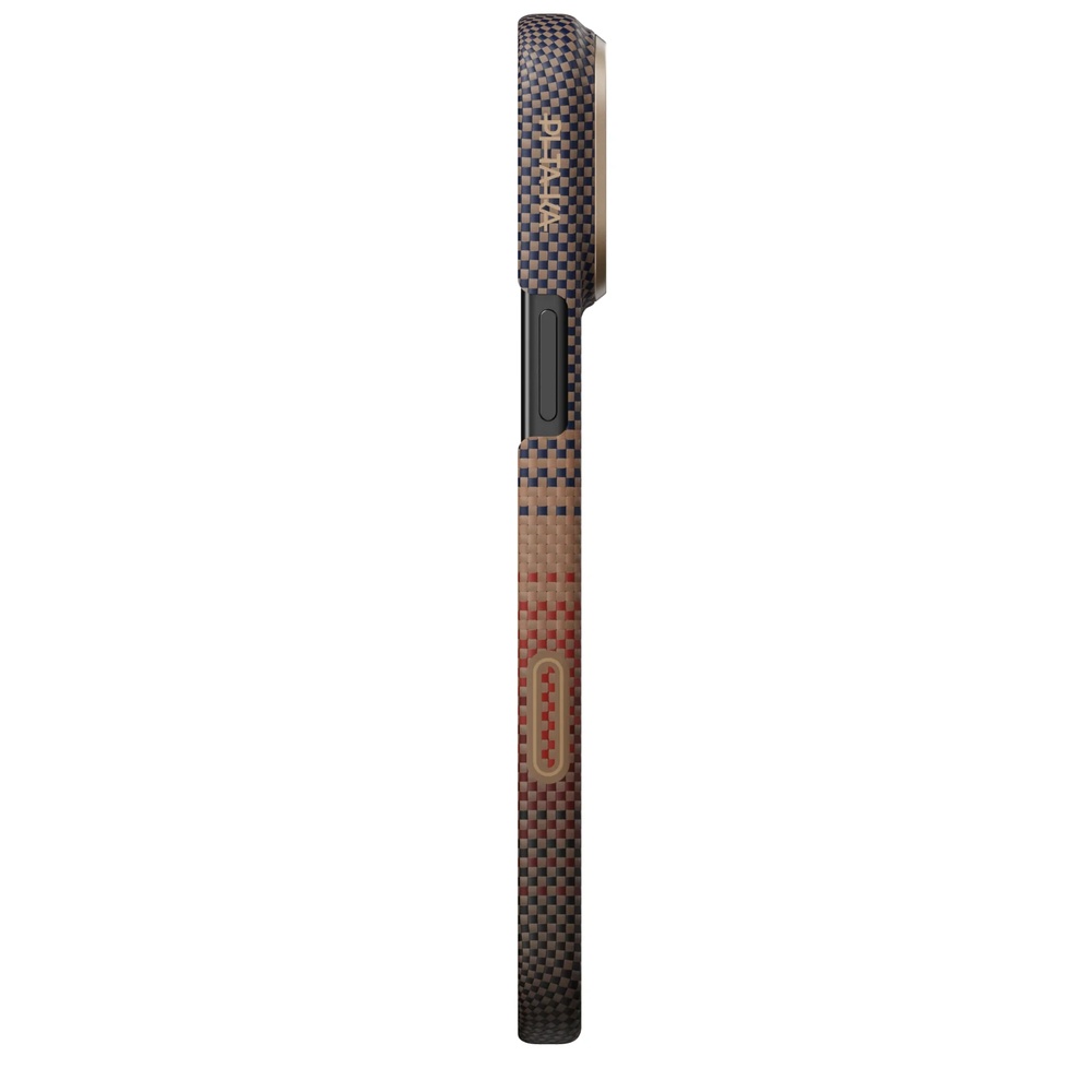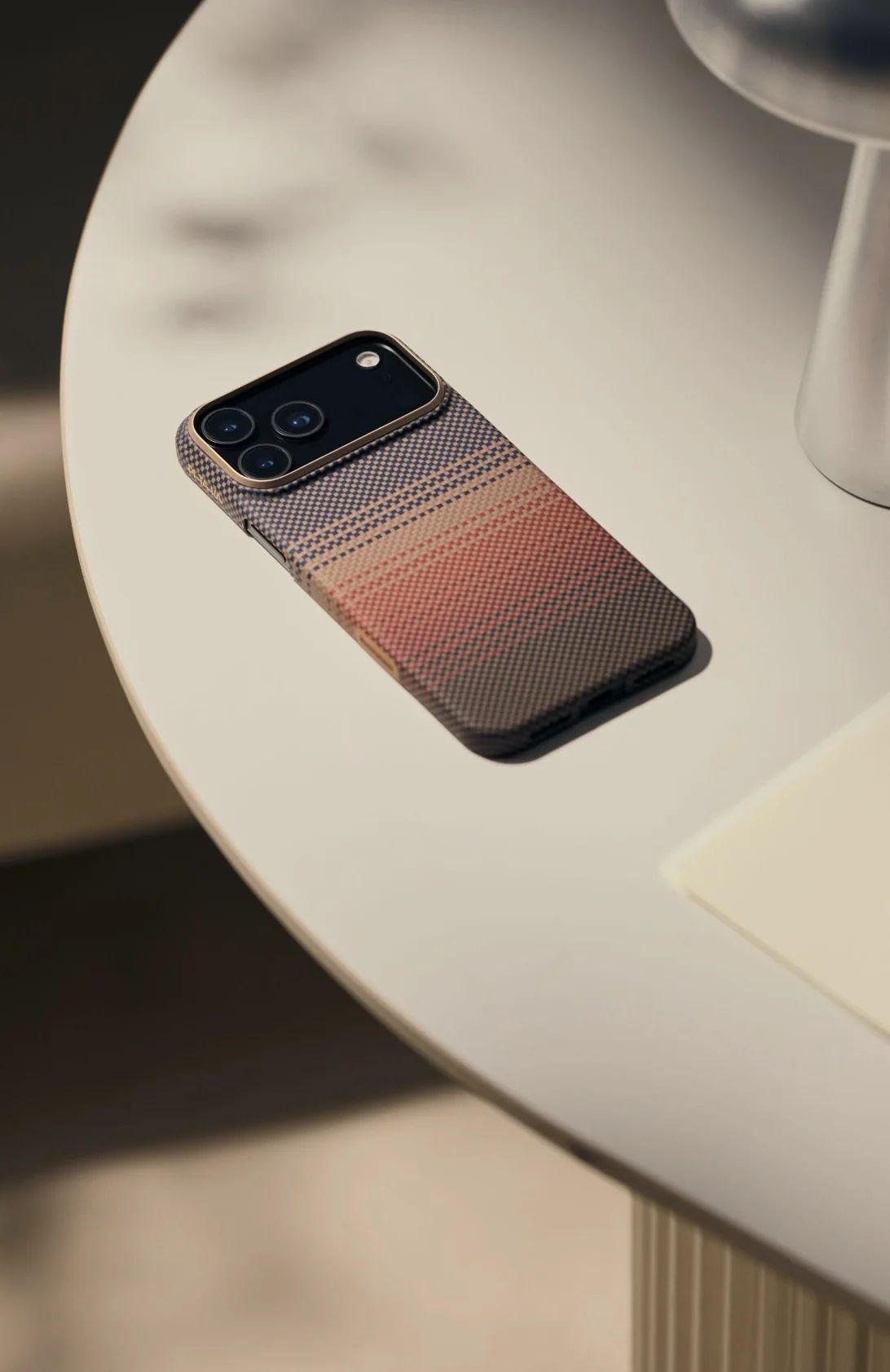A PITAKA gondoskodott arról, hogy az Ultra-Vékony tok minden részlete tökéletesen kivitelezett legyen. A precíz kivágások garantálják a gombokhoz és portokhoz való könnyű hozzáférést, míg a kamera körüli megemelt élek védenek a lencsék felülettel való érintkezésétől. Az aramid szálakból készült tartós szövés modern és elegáns megjelenést biztosít a toknak. Ebben a kiadásban a dizájn a naplementétől a holdkeltéig terjedő átmenetből merített ihletet, egyedülálló karaktert kölcsönözve a tokhoz. A dizájnt a finoman integrált új márkalogó zárja le. A texturált felület javítja a fogást, miközben hangsúlyozza a prémium kategóriás stílust.