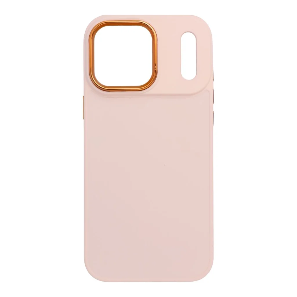 A Frame tok különlegessége a kameraszegély körüli emelt keret, amely tartós PC (polikarbonát) anyagból készült. Ez a keret nem csupán extra védelmet nyújt a kamera lencséinek, hanem galvanizált, rézszínű vagy rózsaarany árnyalatú bevonatával vizuálisan is kiemelkedő, stílusos kontrasztot teremtve a púderrózsaszín alappal. Ugyanezzel a prémium galvanizált bevonattal készültek a tok oldalán található funkciógombok is, amelyek precízen illeszkednek, könnyű nyomáspontot biztosítanak, és harmonikusan kiegészítik a kamerakeret modern megjelenését. A gondosan kialakított, pontos kivágások biztosítják a portok és a hangszórók zavartalan használatát.