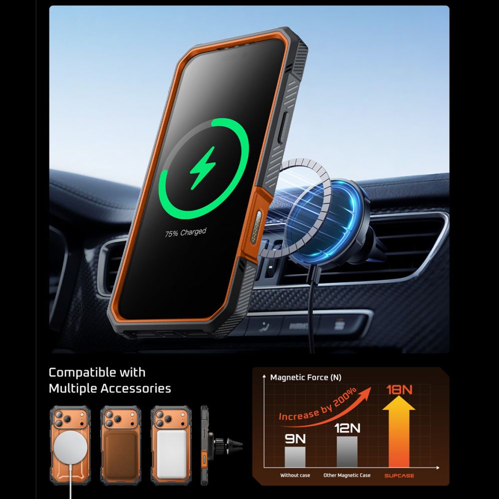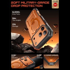 A Supcase UB Grip Pro Magsafe ütésálló tok, amely tökéletesen ötvözi a tartósságot, a funkcionalitást és a modern stílust. Ütésálló TPU anyagból készült, megerősített sarkokkal rendelkezik, amelyek hatékonyan védik a készüléket a leesések ellen, a MIL-STD 810G katonai szabvány szerint (akár 15 lábig). A tok kiemelkedik nyers, katonai dizájnjával, amely hangsúlyozza az okostelefon karakterét és védi a karcolásoktól, valamint a mindennapi sérülésektől. Az tok teljesen kompatibilis a MagSafe technológiával, amely lehetővé teszi a gyors vezeték nélküli töltést és a stabil rögzítést a mágneses kiegészítőkhöz. A beépített MagSafe gyűrű tartóként és állványként is működik, ami növeli a használat kényelmét tartalmak nézése vagy videohívások lebonyolítása közben. A Grip Pro modell egyedi eleme az előlapra szerelhető plusz keret, amely beépített bevonattal védi a kijelzőt. Teljes védelmet nyújt a kijelzőnek külön fólia vagy edzett üveg nélkül. A tok precízen kidolgozott kivágásokkal és gombokkal rendelkezik, a portok pedig por- és szennyeződésvédő dugókkal védettek. A masszív konstrukció ellenére az egész könnyű és kényelmesen felszerelhető a jól átgondolt, kétrészes kialakításnak köszönhetően.