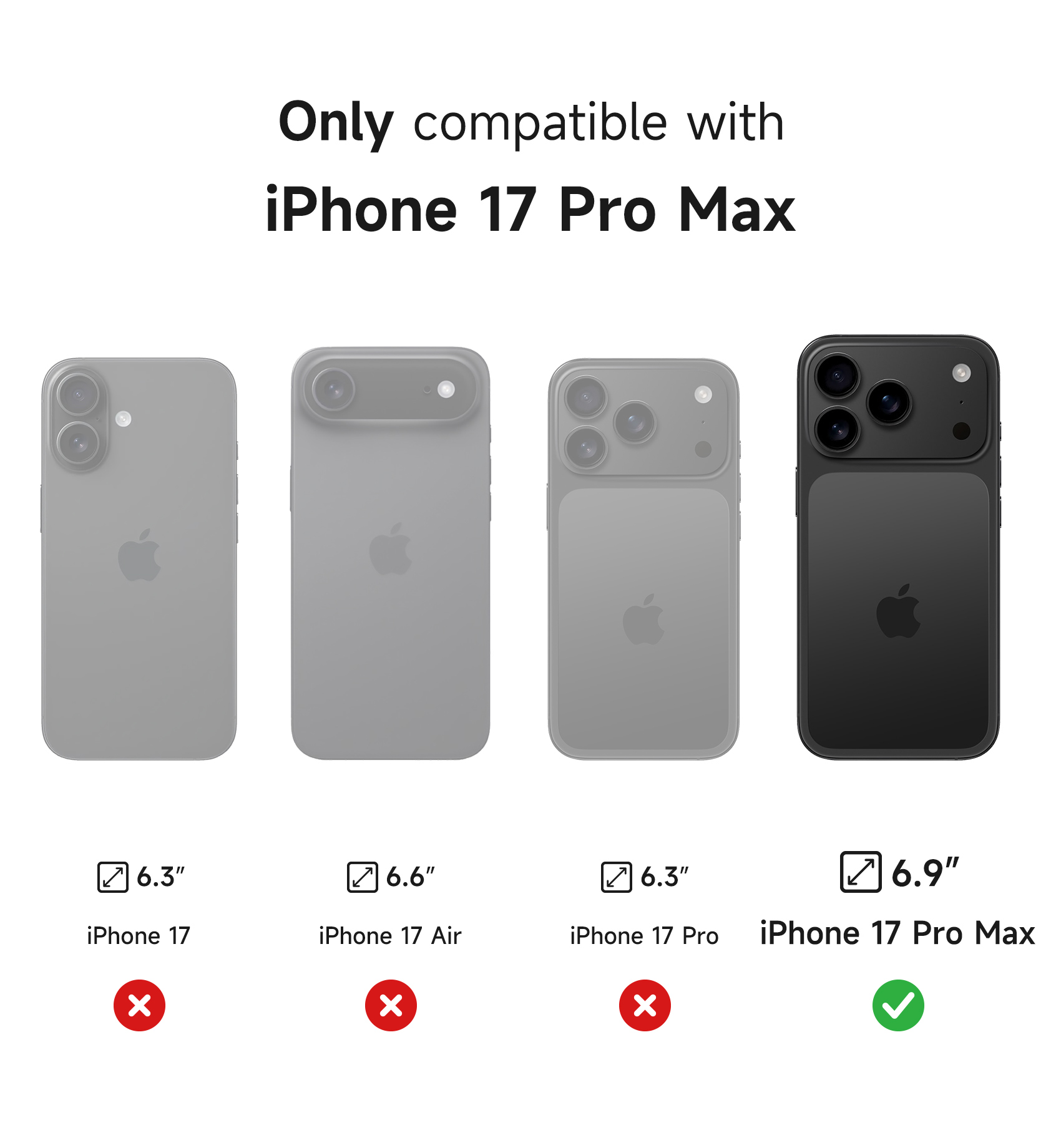 Ez a Suritch tok kizárólag az iPhone 17 Pro Max (6.9 hüvelykes) modellhez készült, garantálva a tökéletes illeszkedést és a problémamentes hozzáférést minden porthoz és gombhoz. Kérjük, győződjön meg róla, hogy a megfelelő készülékhez választja a tokot, mivel más iPhone 17 modellekkel (pl. iPhone 17, iPhone 17 Air, iPhone 17 Pro) nem kompatibilis.