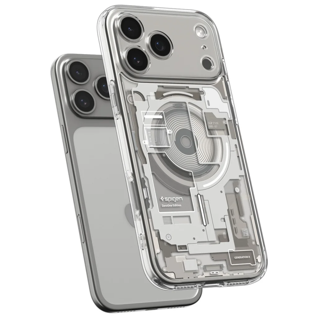 - Áttetsző ZeroOne dizájn: A tok hátlapján az iPhone belső áramköreinek és alkatrészeinek rendkívül részletes, stilizált lenyomata látható. Ez a lenyűgöző "Generation II" kiadás, titán-szürke árnyalataival, egyedi, futurisztikus megjelenést kölcsönöz telefonodnak, miközben a ZeroOne logóval a Spigen minőségét is magán hordozza.
