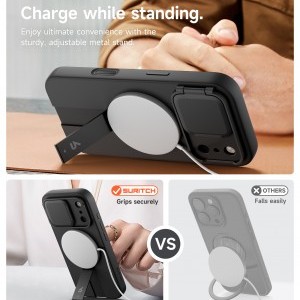 A beépített, robusztus és állítható fém állvány a maximális kényelmet szolgálja. Nézzen videókat, tartson videóhívásokat vagy böngésszen a weben kényelmesen, kéz nélkül. Az állvány stabilan tartja telefonját álló helyzetben is, sőt, akár töltés közben is használható, így a MagSafe töltő csatlakoztatása sem jelent akadályt.