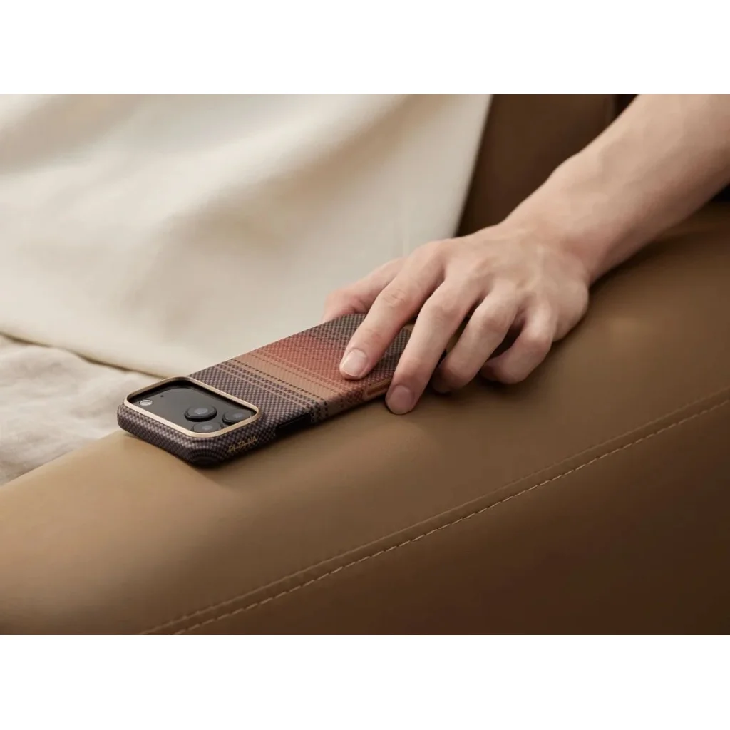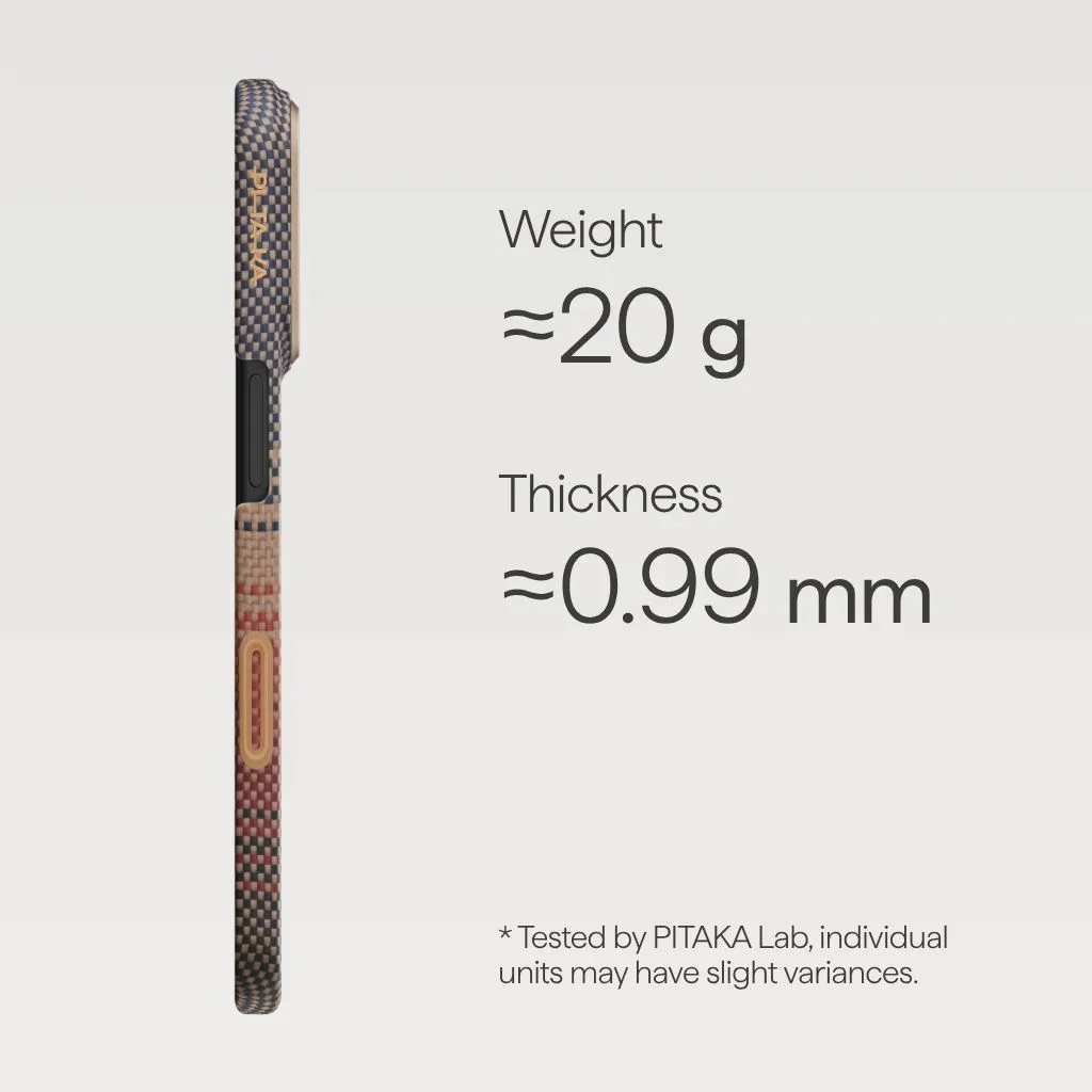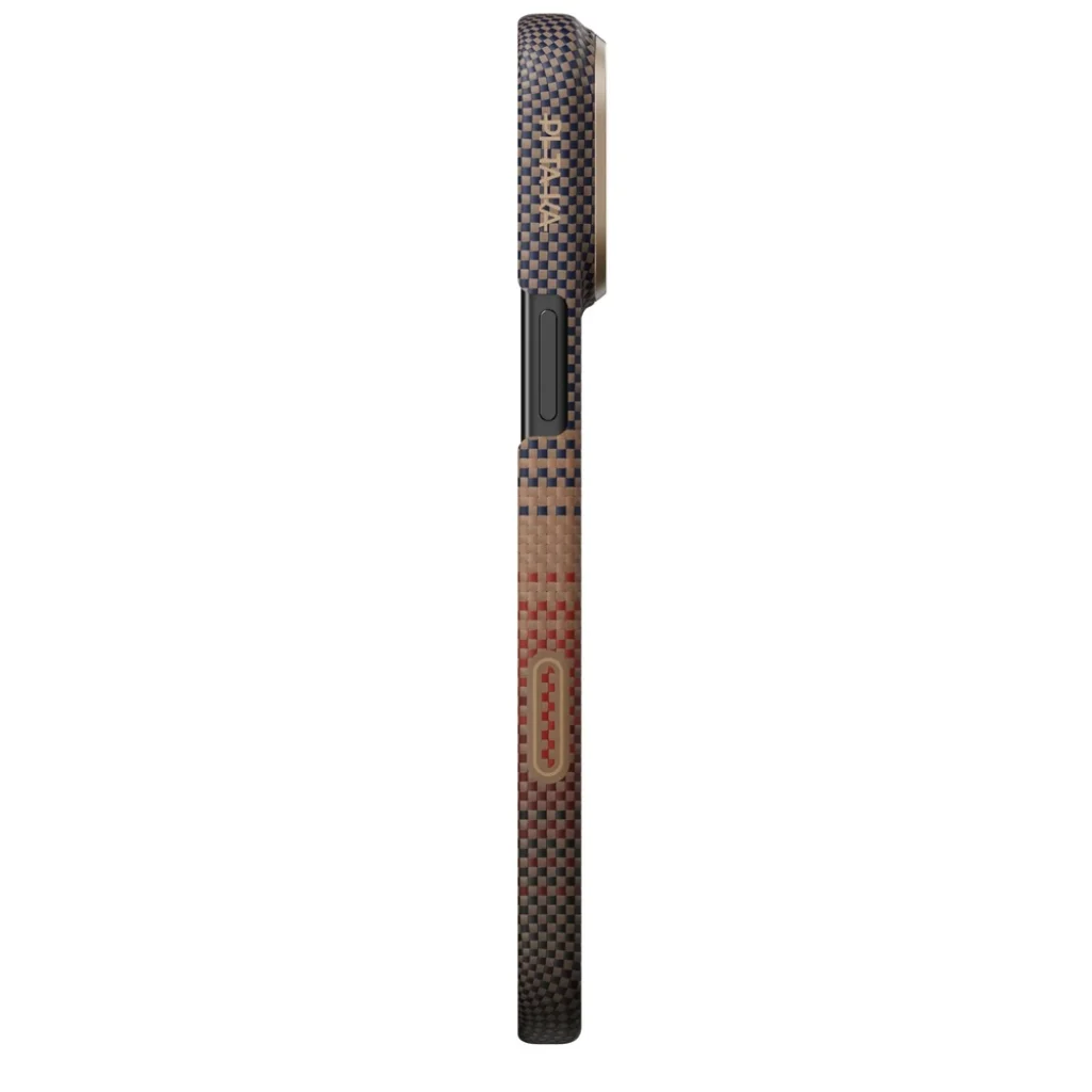 A PITAKA gondoskodott arról, hogy az Ultra-Slim tok minden részlete tökéletesen legyen kidolgozva. Precíz kivágások biztosítják a könnyű hozzáférést a gombokhoz és a portokhoz, míg a kamera körüli emelt élek megvédik a lencséket a felületekkel való érintkezéstől. Az aramid szálból készült tartós szerkezet jellegzetes szövésmintával rendelkezik, amely modern és elegáns megjelenést kölcsönöz a toknak. Ebben a kiadásban a dizájn egy különleges Naplemente · Holdkelte motívummal van díszítve, amelyet a naplementéből a holdkeltébe való átmenet inspirált, és egyedi karaktert ad a toknak. A tervezést az új márkalogó egészíti ki, amely finoman integrálva van a dizájnba. A texturált felület javítja a fogást, miközben kiemeli a prémium osztályú stílust.