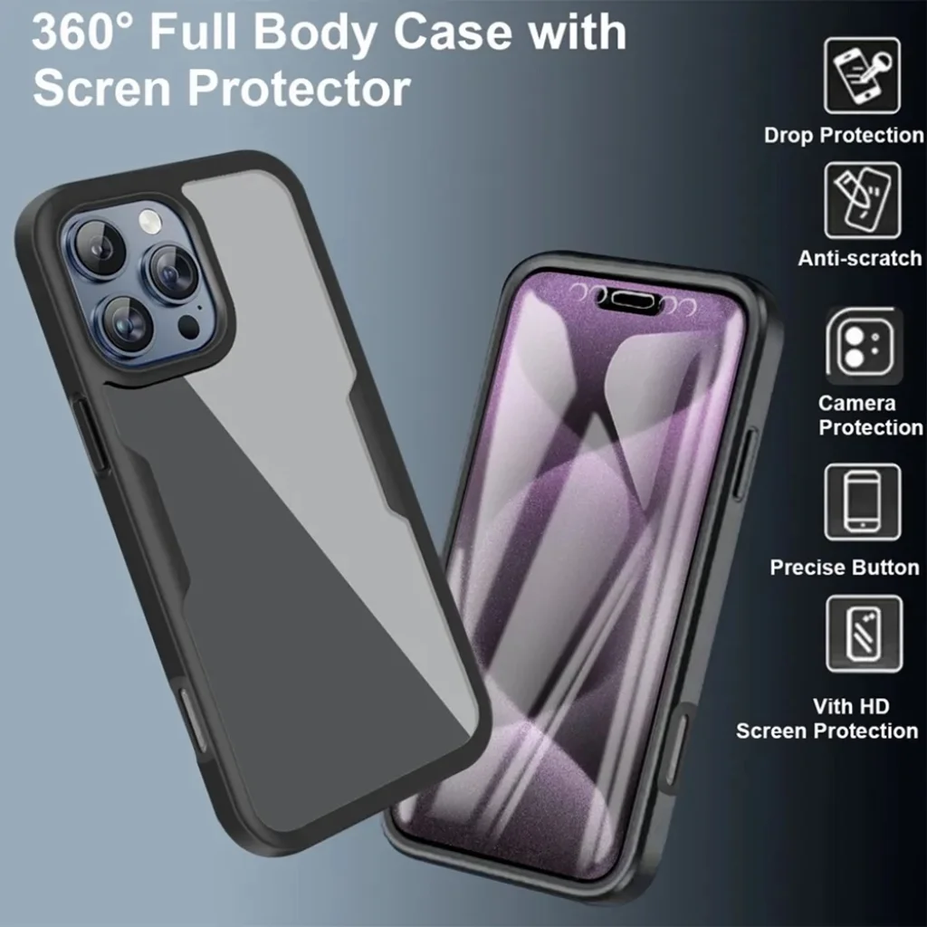 - 360°-os teljes védelem: Ez a tok nem csupán a telefon hátulját védi, hanem egy integrált előlapi résszel és beépített képernyővédővel is rendelkezik, amely átfogó védelmet nyújt a készüléknek, a sarkoktól az élekig.