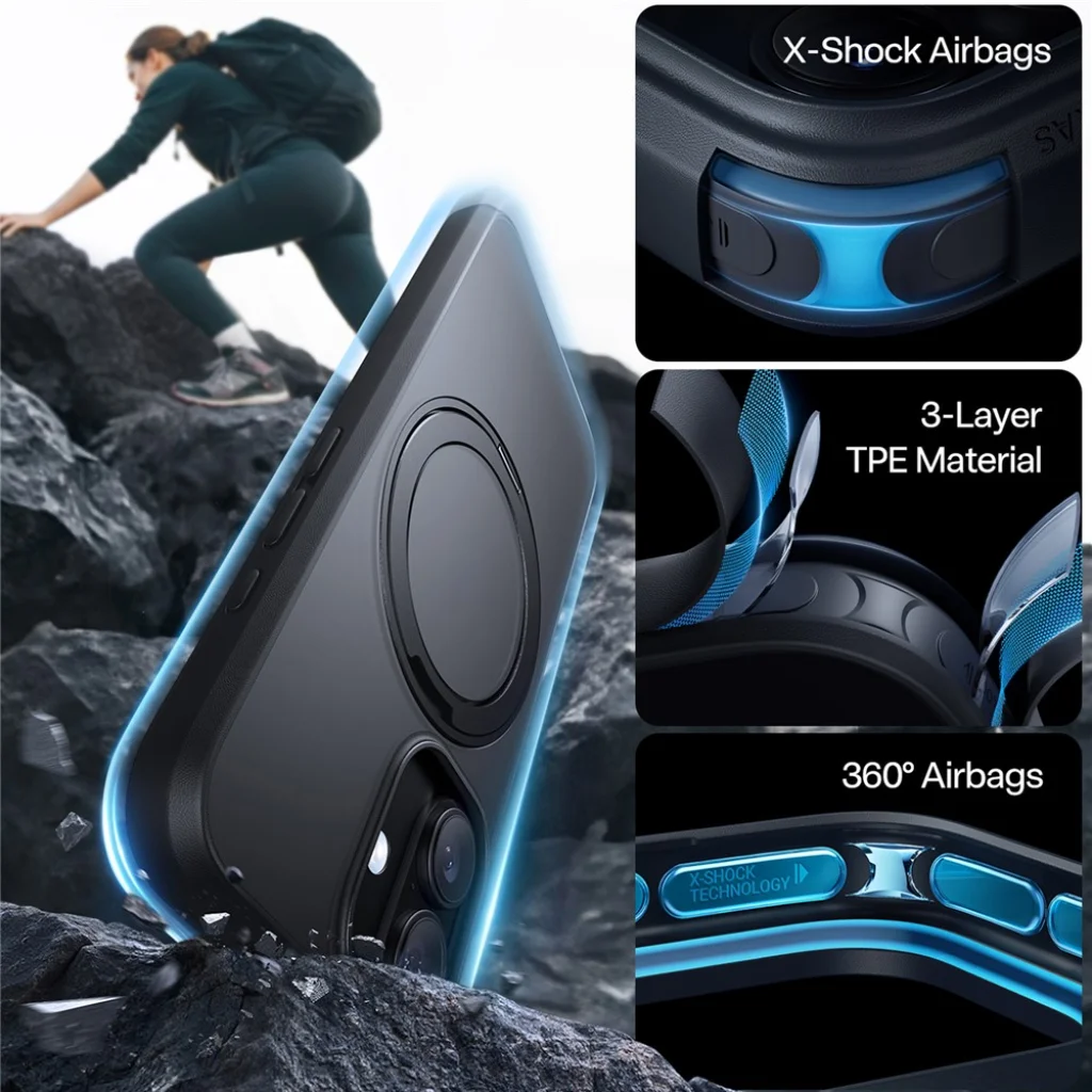 Ne aggódjon többé a leejtés miatt! A Torras Ostand Pro tokot a legmagasabb szintű védelemmel tervezték. Az innovatív X-Shock légzsákok a sarkokban és a 3 rétegű TPE anyag 360°-os védelmet biztosítanak. A katonai szintű ütésálló kialakítás megvédi iPhone 17 készülékét a mindennapi ütközésektől, karcolásoktól és esésektől, így készüléke mindig biztonságban marad, még extrém körülmények között is.