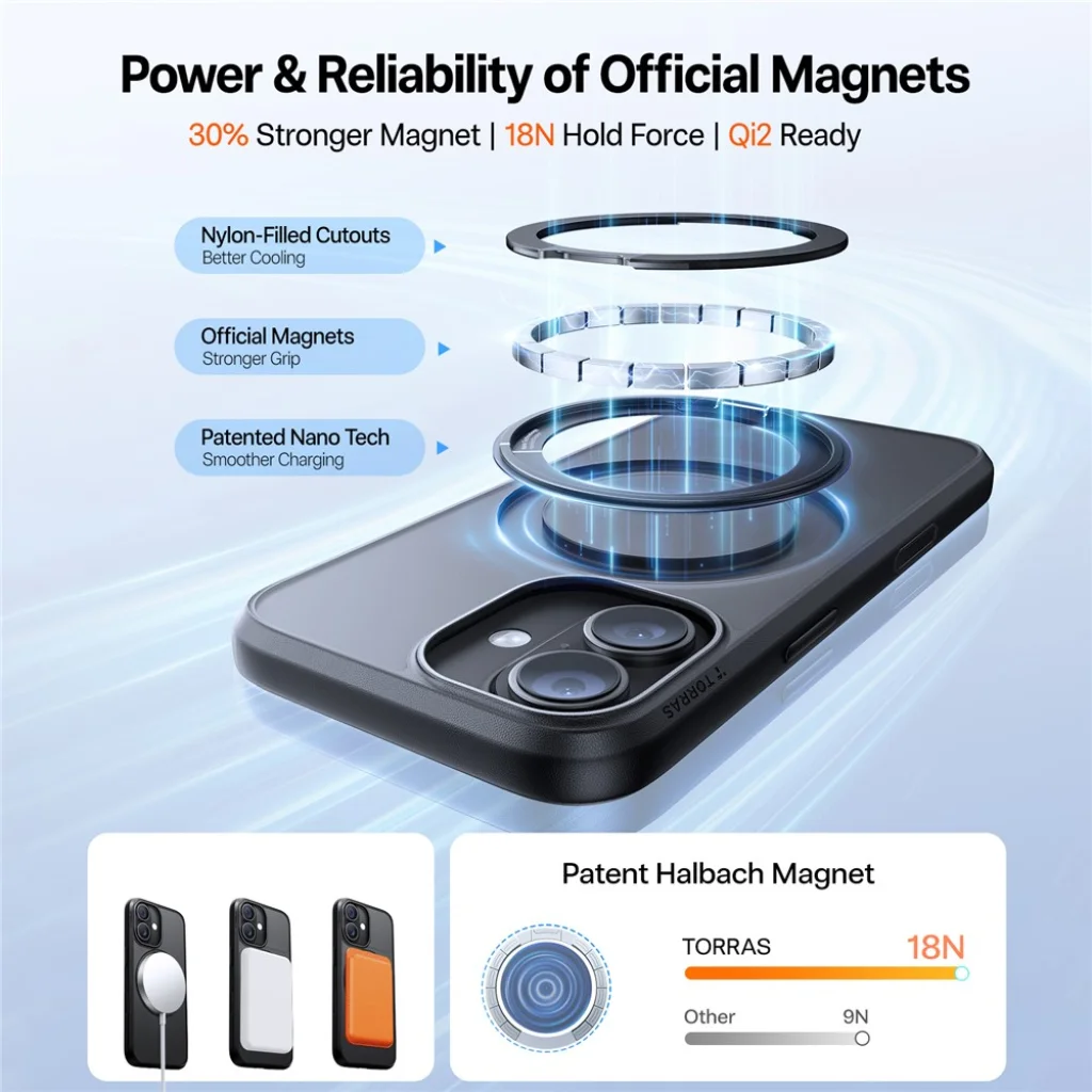 Élvezze a MagSafe technológia teljes erejét! A Torras Ostand Pro tok 30%-kal erősebb, 18N tartóerővel rendelkező hivatalos MagSafe mágnesekkel rendelkezik, köszönhetően a szabadalmaztatott Halbach mágneses technológiának. Ez stabil és biztonságos rögzítést garantál minden MagSafe tartozékhoz, legyen szó vezeték nélküli töltésről (Qi2 ready) vagy mágneses autós tartókról és pénztárcákról. A szabadalmaztatott Nano Tech továbbá biztosítja a simább és hatékonyabb töltést.