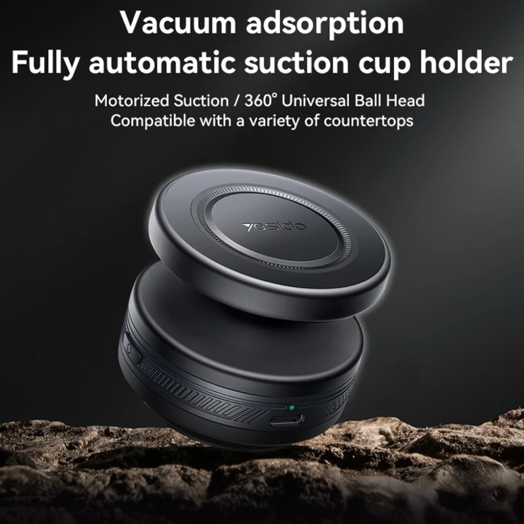 A teljesen automatikus tapadókorongos tartó motoros vákuumfunkcióval és 360°-os univerzális golyós fejjel rendelkezik. Ez a sokoldalúság lehetővé teszi, hogy a tartót ne csak autók műszerfalán, hanem otthon vagy irodában, különböző felületeken (pl. üveg, fa, márvány) is hatékonyan használja. Az önragasztó talp tovább növeli a rögzítési lehetőségek számát.
