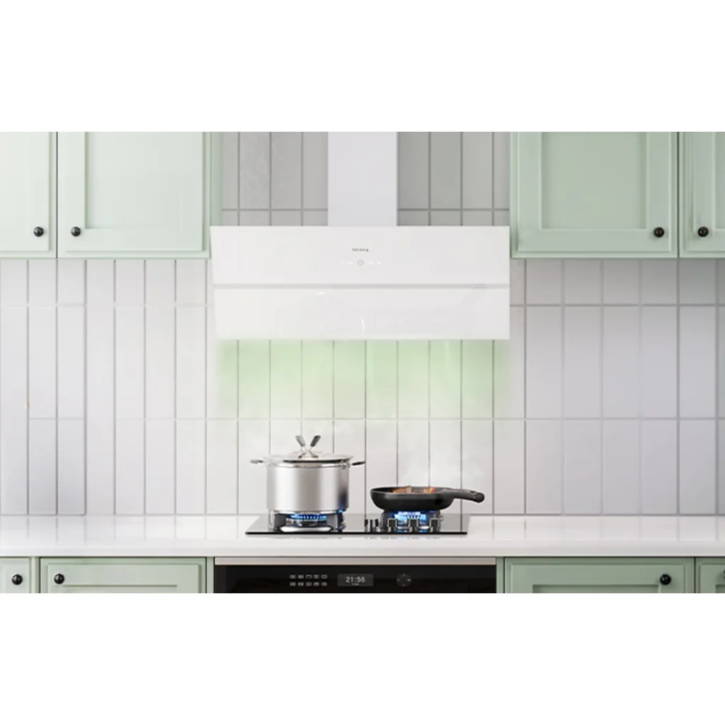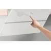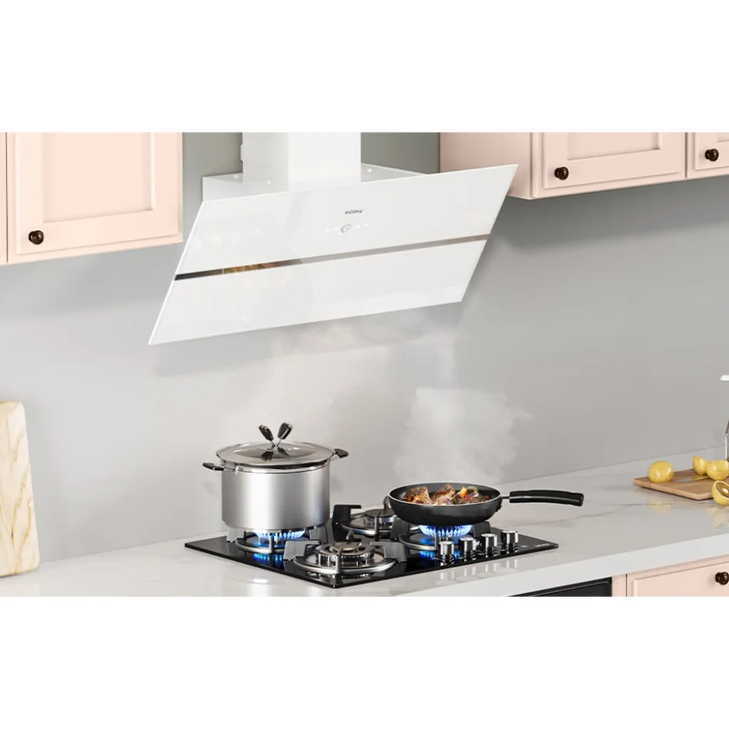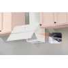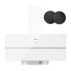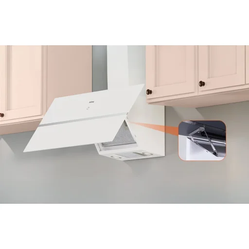Modern kialakításának és átgondolt dizájnjának köszönhetően a páraelszívó modern, ferde formájával tűnik ki, elülső része két réteg fehér üvegből áll. Az elülső panelek 45°-os szögben helyezkednek el, ami könnyedséget és eleganciát kölcsönöz a készüléknek. Ez a kialakítás lehetővé teszi, hogy a felhasználó több helyet nyerjen a főzőlap felett.