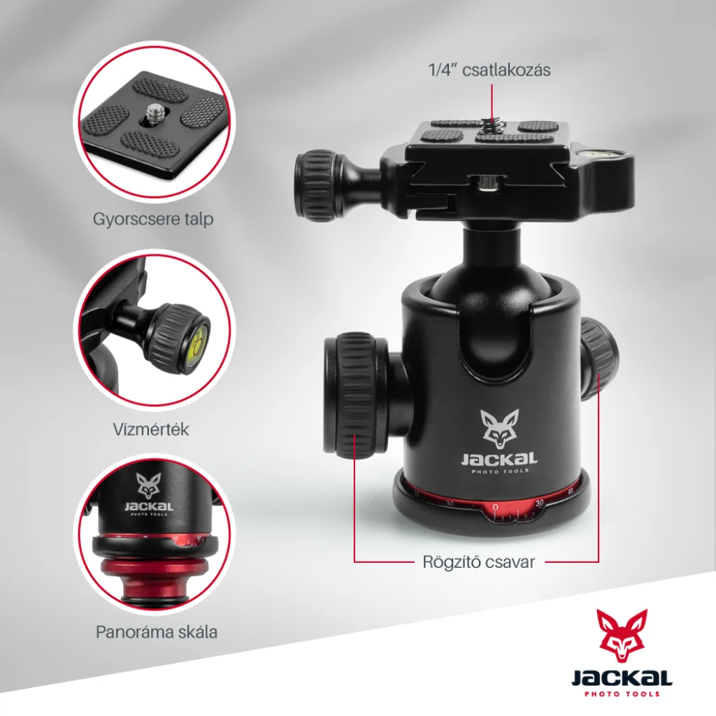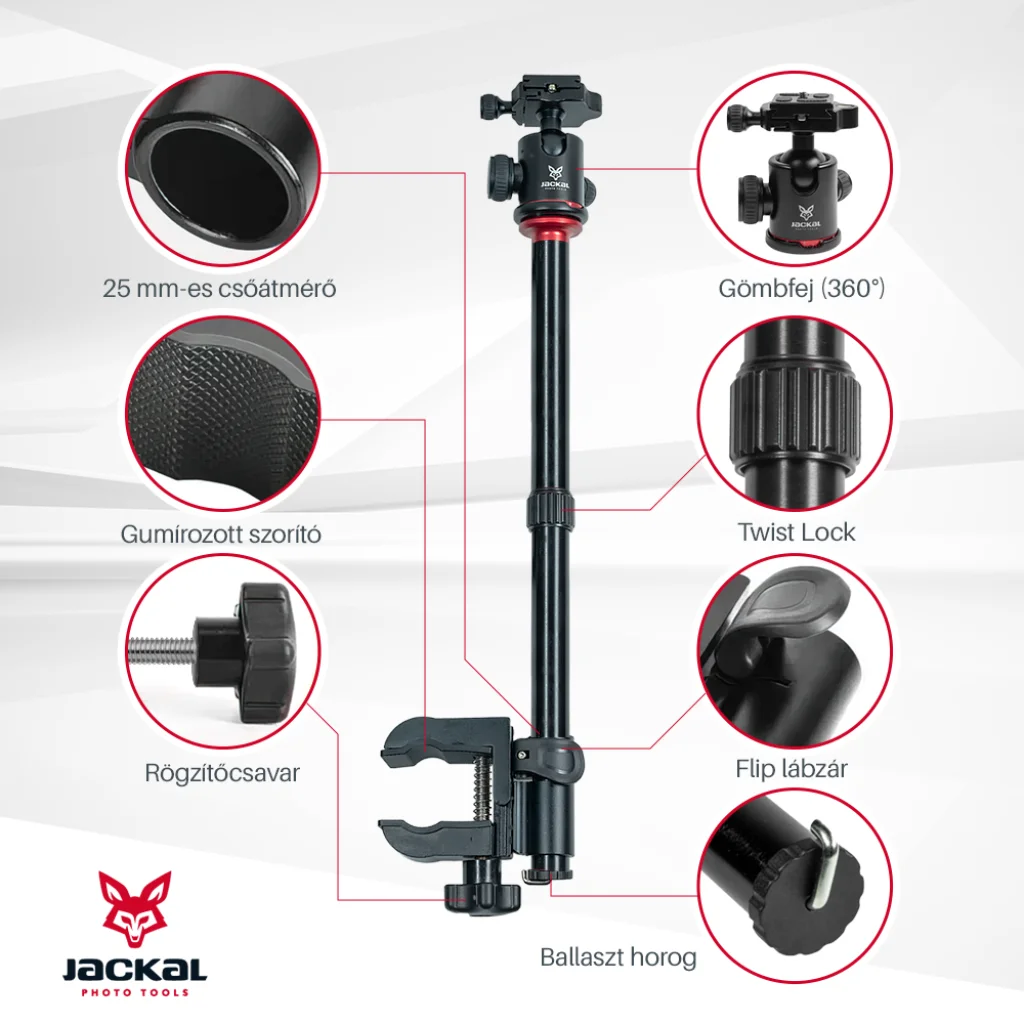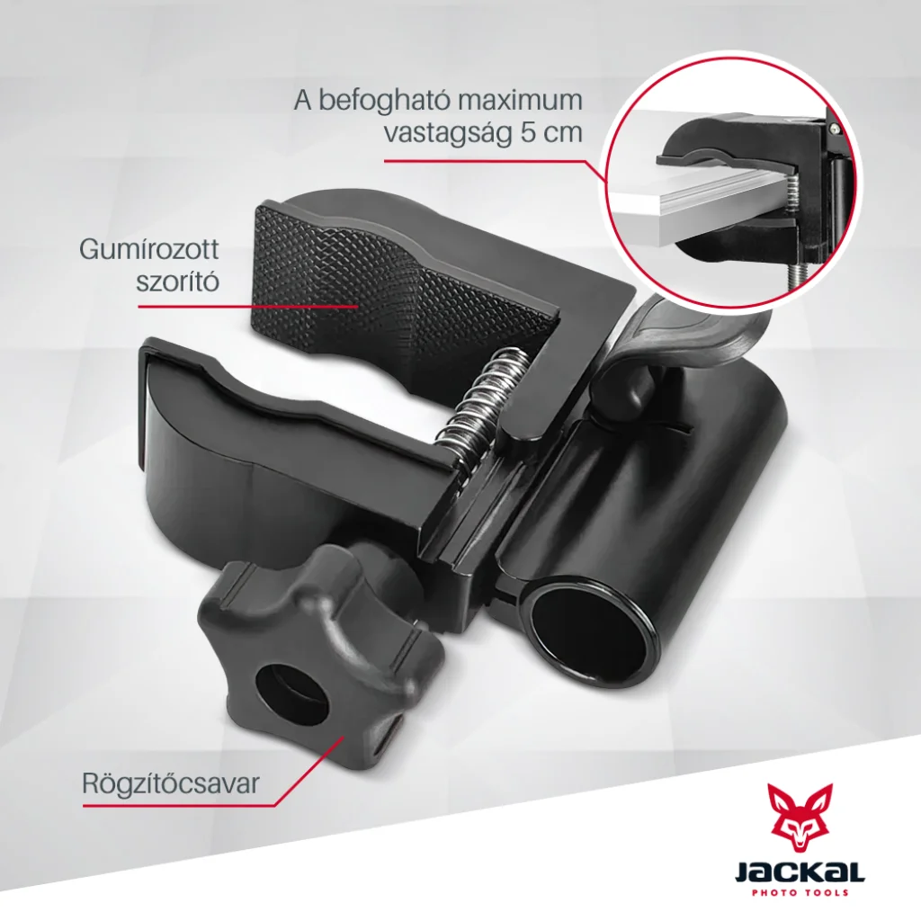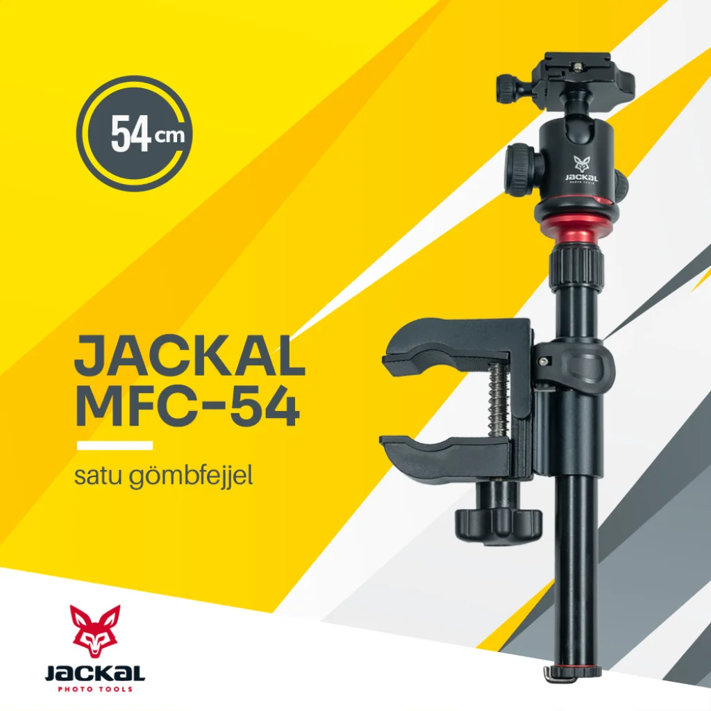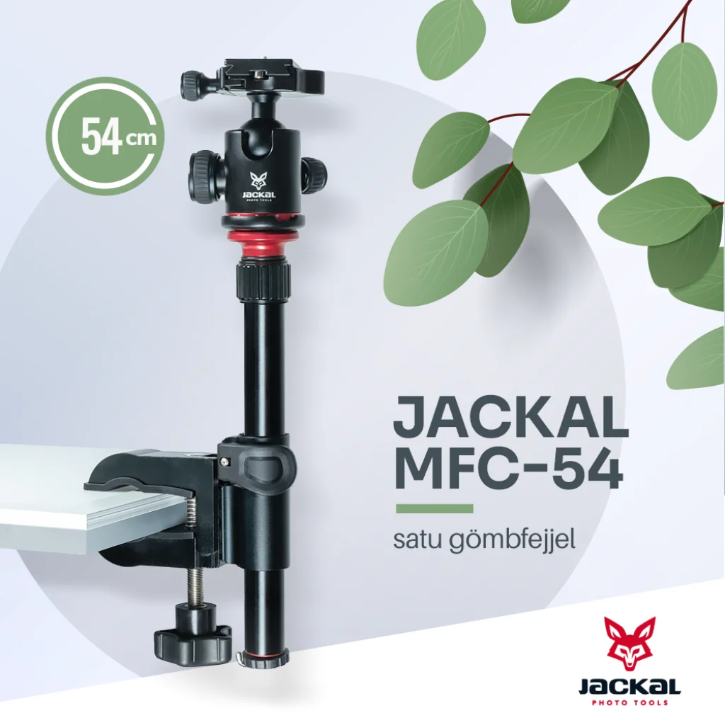 A Jackal MFC-54 satu segítségével könnyedén rögzíthetjük fényképező gépünket, világításunkat asztallapra, csőre, igazából bármire ami 5cm-nél vékonyabb. A satu gumírozott, így jobb tapadást biztosít, illetve nem karcolja a befogott tárgyat. Az oszlop állítható hosszúságú(Twist lock), pozíciója mozgatható(flip zár). A pontos beállításhoz a fejen található gömbfej lesz segítségünkre.