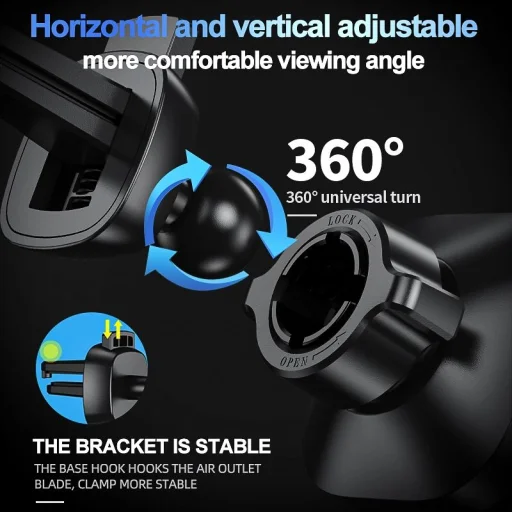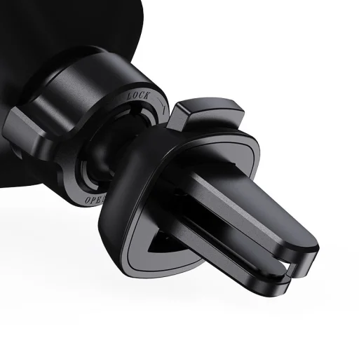 • Stabil rögzítés a szellőzőnyíláson: Az innovatív, kampós kialakítású rögzítőmechanizmus szorosan illeszkedik az autó légbeömlő nyílásának lamelláihoz. A stabil tartás érdekében a rögzítő gombnyomással oldható és szorítható, garantálva, hogy a tartó ne mozduljon el vezetés közben. Felszerelése és eltávolítása mindössze másodperceket vesz igénybe.