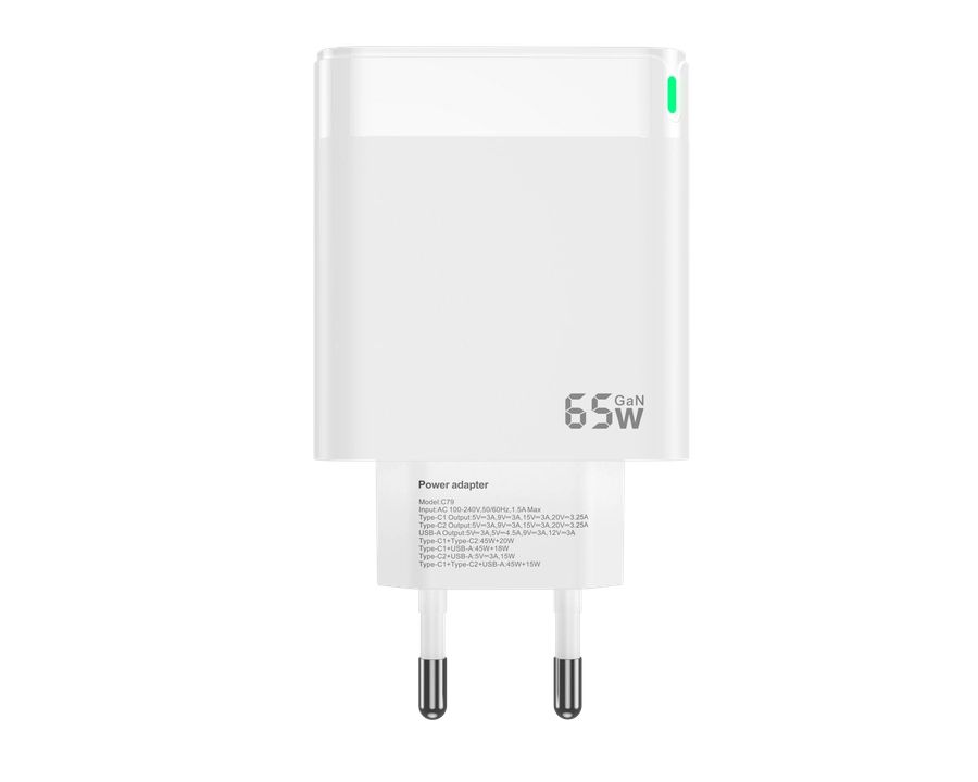 - Type-C2 kimenet: 5.0V=3.0A, 9.0V=3.0A, 15.0V=3.0A, 20.0V=3.25A (Maximum 65W)