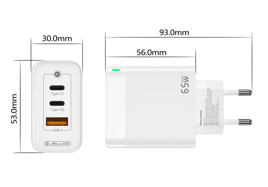 A JELLICO C79 töltő univerzális kompatibilitást kínál, legyen szó okostelefonokról, tabletekről, laptopokról vagy más USB-n keresztül tölthető eszközökről. Kompakt mérete (53.0mm x 30.0mm x 56.0mm – magasság x szélesség x mélység) és letisztult fehér színe révén tökéletesen illeszkedik bármilyen környezetbe, minimális helyet foglalva az aljzatban vagy a táskájában. A termék bliszteres csomagolásban érkezik.