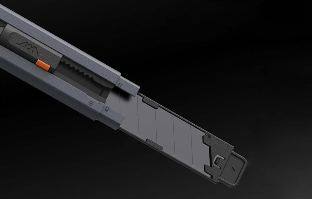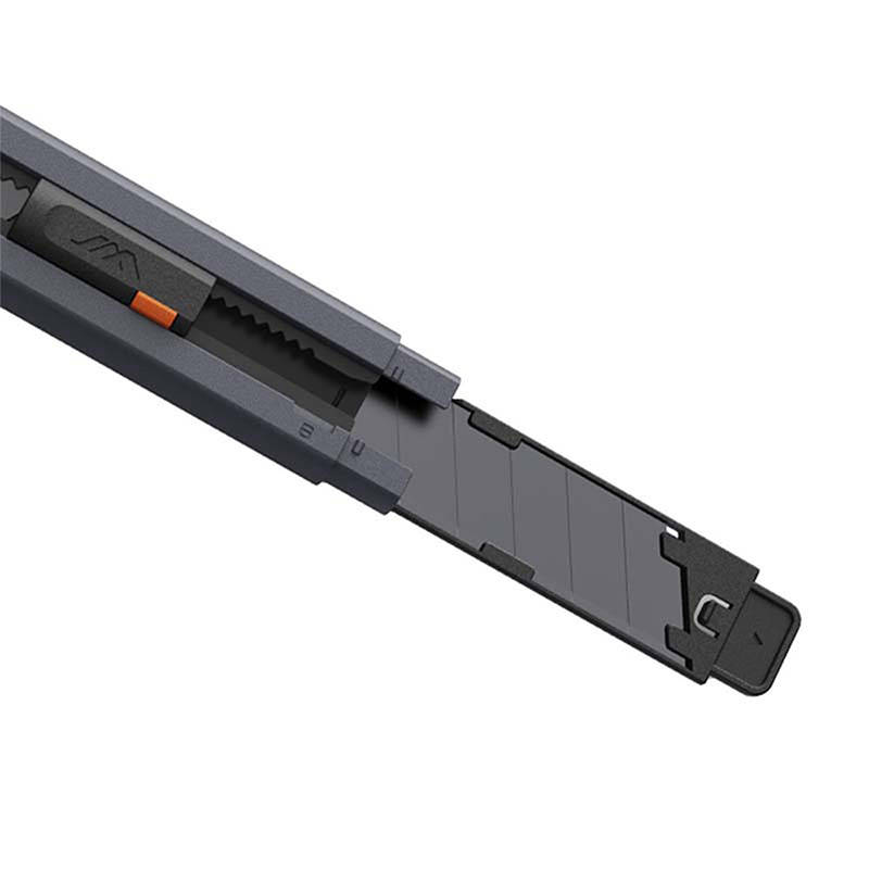 Az alsó rész dugójának eltávolításával hozzáférhet a tartalék pengékhez. A dugó emellett segít a kés hegyének hatékony letörésében, még munkakesztyűben is, minimalizálva a sérülés esélyét.