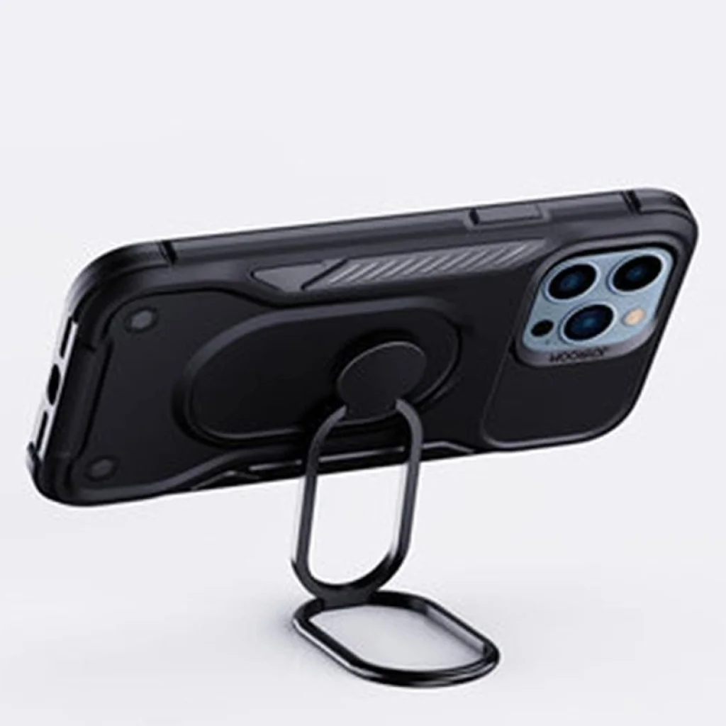 - Beépített gyűrűtartó - a tok beépített forgatható és összecsukható fogantyúval lett felszerelve, amely megkönnyíti a telefon kézben tartását, és állványként is funkcionál, lehetővé téve a telefon függőleges és vízszintes elhelyezését.