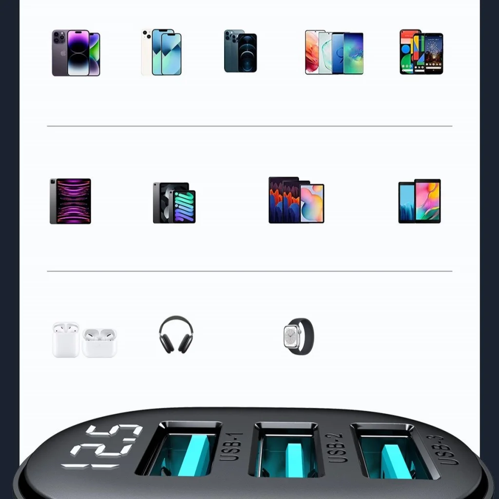 Joyroom JR-CCD03 autós töltő digitális kijelzővel és 3 USB porttal Kíváncsi vagy, hogyan töltheted hatékonyan az összes eszközödet az autódban anélkül, hogy lemerítenéd az akkumulátort? A Joyroom JR-CCD03 autós töltő egy olyan megoldás, amely kombinálja a funkcionalitást és a biztonságot. A 3 USB-A portnak köszönhetően egyszerre három eszközt tölthetsz, és a beépített digitális kijelző lehetővé teszi az autó akkumulátorának feszültségének valós idejű nyomon követését. Ez a tűzálló anyagból készült készülék nemcsak hatékony, de biztonságos töltést is biztosít, csökkentve a hőtermelést. A Joyroom JR-CCD03 autós töltő legfontosabb előnyei:- Egyszerre három eszközt tölt. A 3 USB-A porttal a töltő lehetővé teszi több eszköz gyors és hatékony töltését egy időben, megszüntetve annak szükségét, hogy válassz, melyik eszközt töltsd először.