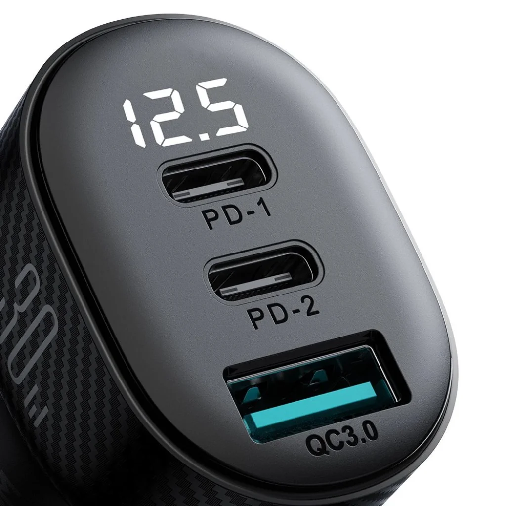 Joyroom JR-CCD04 autós töltő, akár 30W teljesítménnyel, 3 porttal (2x USB-C, USB-A) és kijelzővel - fekete Merülj el a korlátlan teljesítmény és kényelem világában a Joyroom JR-CCD04 autós töltővel, amely akár 30W teljesítményt nyújt. Három porttal - két USB-C és egy USB-A - van felszerelve, amelyek lehetővé teszik három eszköz egyidejű töltését. A beépített digitális kijelző lehetővé teszi a valós idejű feszültségfigyelést, biztosítva a biztonságot és a hatékonyságot. A legújabb töltési protokollok támogatásával gyorsan és biztonságosan töltheted eszközeidet. A töltő tűzálló anyagból készült, amely minimalizálja a hőtermelést, biztosítva a biztonságos használatot.