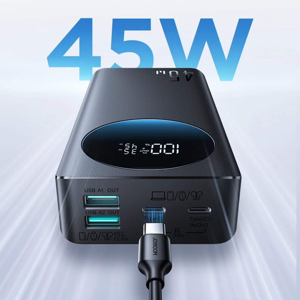 A Joyroom JR-PBF02 Pro külső akkumulátor ideális társ mindazoknak, akik kompromisszumok nélkül szeretnék eszközeiket tölteni. A 20000 mAh kapacitás és a 45 W-os gyorstöltési technológia révén okostelefonja, táblagépe vagy akár laptopja is villámgyorsan újra munkára kész lehet.