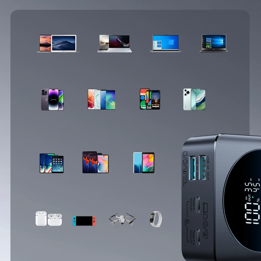 Felejtse el a várakozást! A két USB-A és két USB-C port lehetővé teszi, hogy egyszerre akár négy eszközt is töltsön. Legyen szó munkáról vagy utazásról, ezzel a powerbankkel minden kütyüje folyamatosan üzemképes marad.