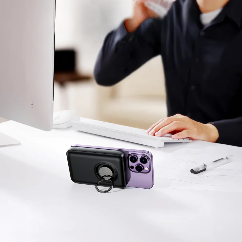 Fedezze fel a Joyroom indukciós power bankot egy kényelmes gyűrűs állvánnyal. Ez egy okos 2 az 1-ben megoldás: csatlakoztassa a power bankot telefonjához, és további támogatást és stabilitást kap. A gyűrű segítségével kényelmesen kézben tarthatod a telefont, az állványon pedig a kezed használata nélkül nézhetsz videókat és fotókat. Ez az induktív power bank vékony és kompakt. Kényelmes kapacitása 10 000 mAh. A beépített Power Delivery technológiának és az akár 20 wattos teljesítménynek köszönhetően gyorsan és hatékonyan tölti fel készülékét. A Joyroom JR-W050 indukciós power bank lehetővé teszi két eszköz egyidejű töltését is. Az oldalsó LED-es háttérvilágításból megtudhatja, hogy mennyi energia maradt a power bankban.