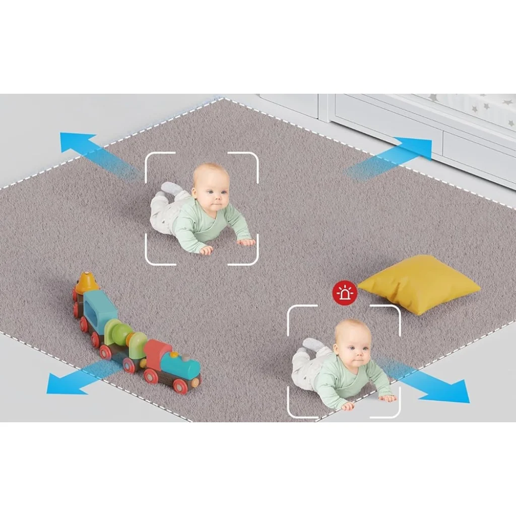 Tárgyak követése: A tárgykövető funkcióval a kamera automatikusan követi a baba mozgását, állítva a kamera szögét. Ezáltal átfogó felügyeletet biztosít, ideális az aktív kisgyermekek figyelemmel kísérésére. A BabySafe Zone funkció lehetővé teszi egy virtuális AI terület beállítását, amely riasztást küld, ha a gyermek elhagyja a biztonságos zónát.
