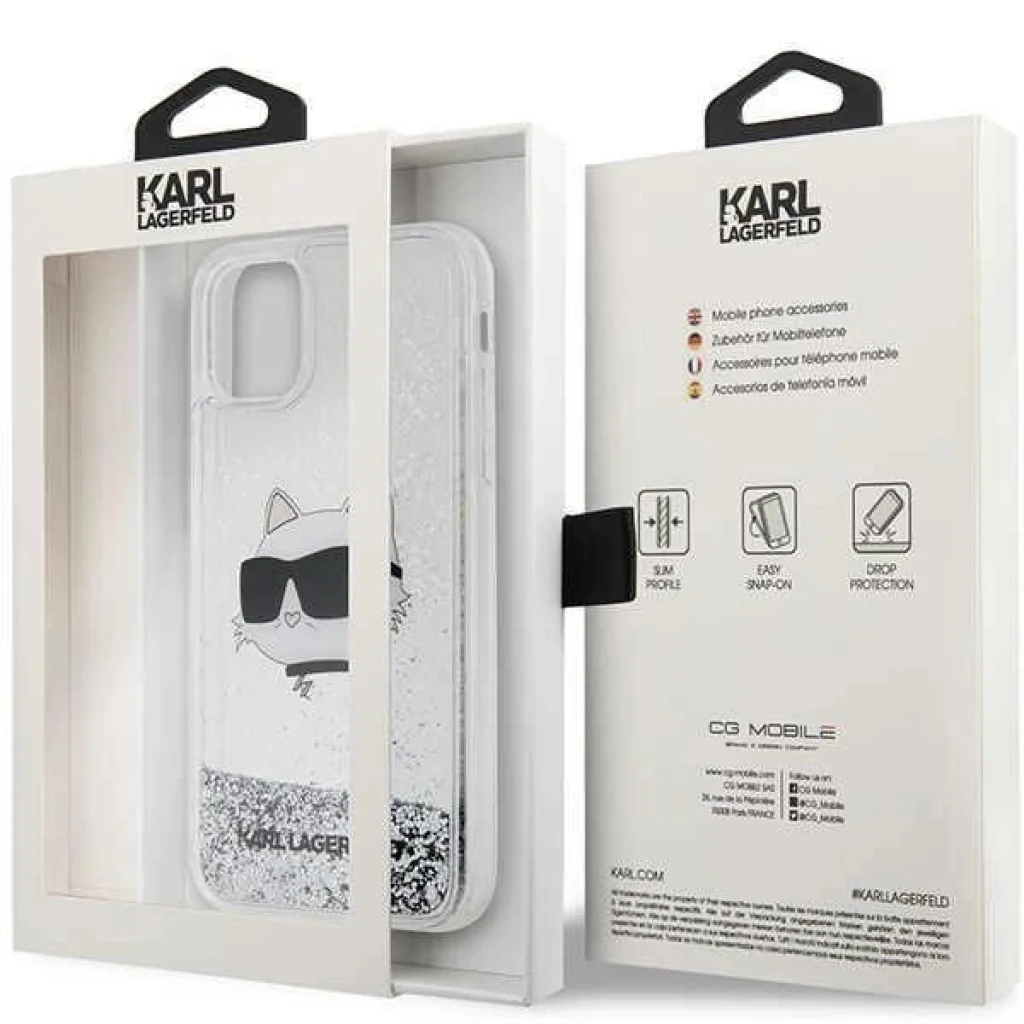 A legendás Karl Lagerfeld, világhírű divattervező által megalkotott védőtök kollekció. A tokot folyékony csillámporos részecskék díszítik, amelyek a fényben csillognak, és változtatják elrendezésüket a hajlásszög változásának hatására. A klasszikus átlátszó tokot vizuális hatásán kívül a tervező macskájának, a híres Choupette-nek a képe is díszíti. A tok magas minőségű, tartós, kopásálló műanyagból készült. Erős és kemény polikarbonát (hátlap) és rugalmas TPU szilikon (oldalak) kombinációja.