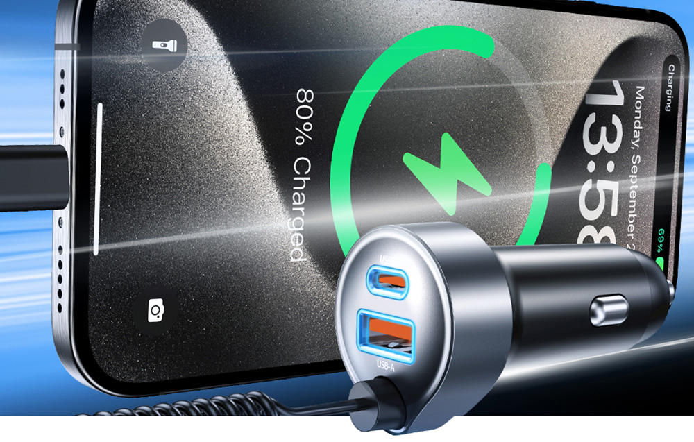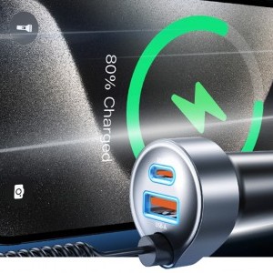A Choetech TC0030 65W 1C1A autós töltő 1,2 méteres rugós kábellel egy kompakt és nagy teljesítményű készülék, amely minden utas igényét kielégíti, és több eszköz egyidejű töltését kínálja maximális teljesítmény mellett. Az USB-C és USB-A porttal felszerelt töltő lenyűgöző teljesítményt nyújt - 35W az USB-C porton, illetve 30W az USB-A porton - az okostelefonok és a nagyobb eszközök, például a táblagépek gyors és hatékony töltéséhez.
