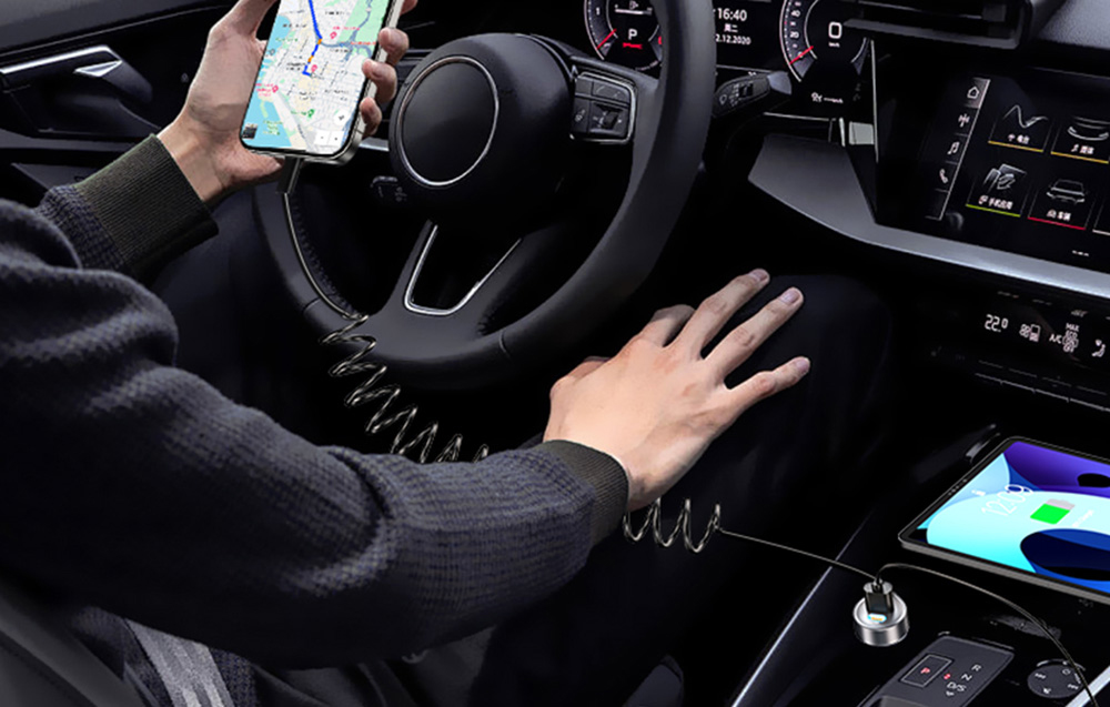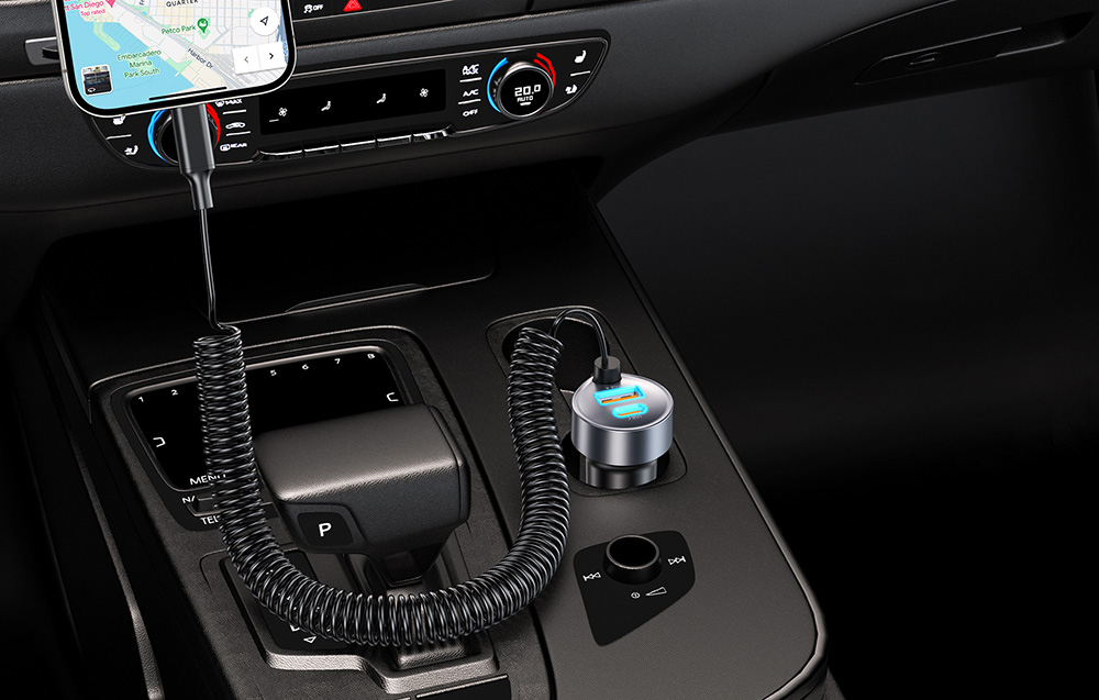 Rugalmas rugós kábel. Az 1,2 méter hosszú rugós kábel igazi kényelmet nyújt útközben. Rugalmas kialakításának köszönhetően a kábel nem gubancolódik, használaton kívül pedig kompakt formába gurul vissza, így kiküszöbölve a lógó és összegabalyodott kábelek problémáját. Nagyszerű megoldás a járművezetők és az utasok számára - mindenki könnyen hozzáférhet a portokhoz anélkül, hogy túl sok helyet foglalna.