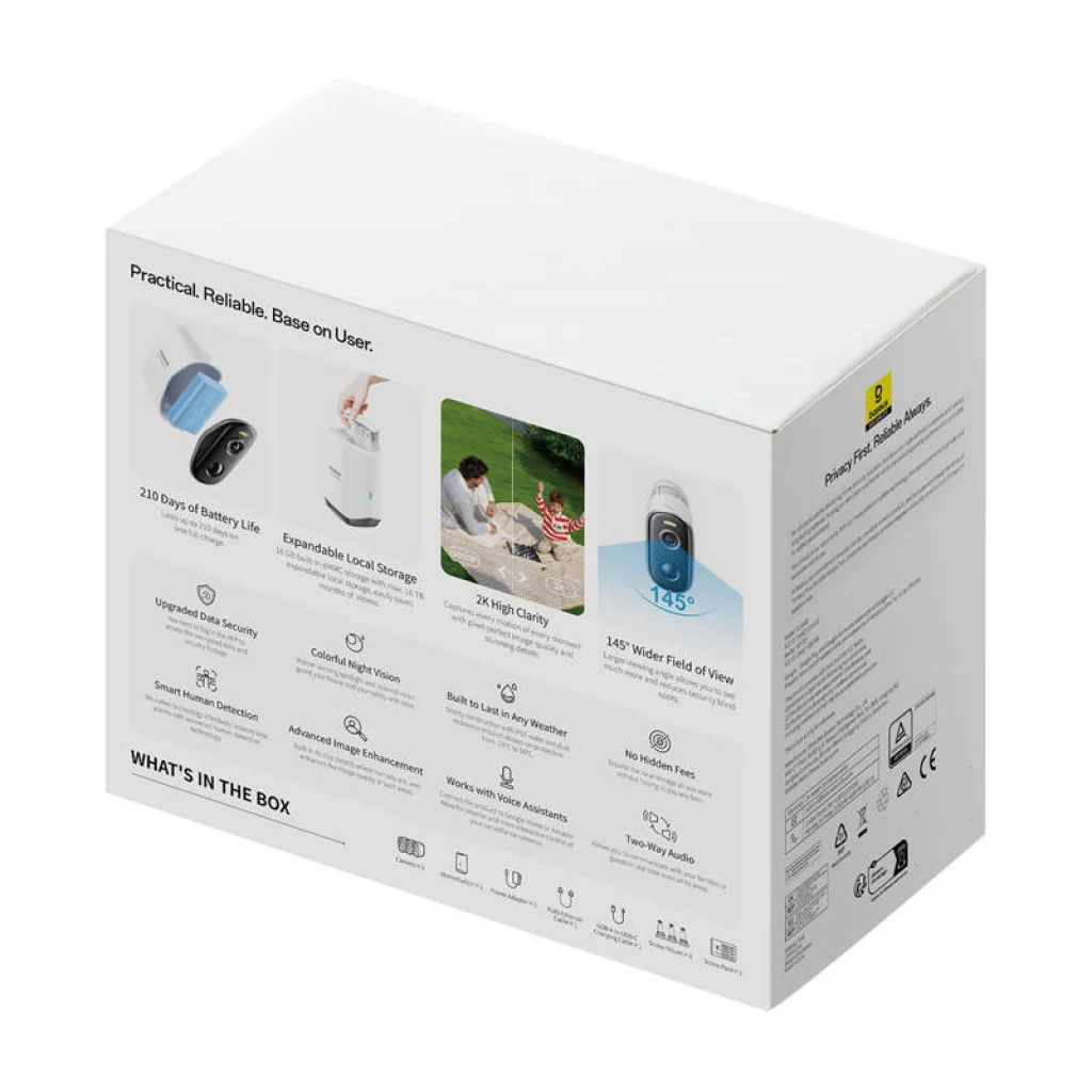 Minden Baseus N1 kamera akár 210 napos használatot garantál egyetlen feltöltéssel a nagy teljesítményű, 7800 mAh-s akkumulátornak köszönhetően. Évente mindössze egyszer kell feltöltenie, így folyamatos védelmet élvezhet anélkül, hogy aggódnia kellene a gyakori töltés miatt. A vezeték nélküli kialakítás egyszerű és gyors telepítést tesz lehetővé bárhol, kábelezés nélkül, a stabil 2,4 GHz-es Wi-Fi kapcsolat pedig megbízható élőképet és folyamatos jelátvitelt biztosít.