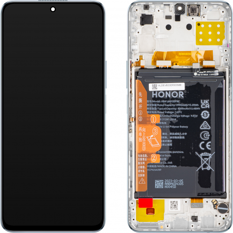 Includes display frame, speaker, vibrating motor, battery, side buttons and fingerprint sensor.