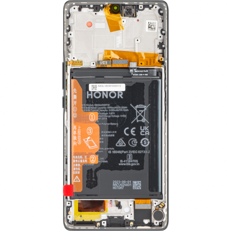 LCD kijelző modul Honor Magic5 Lite-hez - éjfekete Csere LCD kijelző modul Honor Magic5 Lite-hez - eredeti szervizalkatrész. Az LCD kijelző modul eredeti, és pontosan megegyezik azzal, amit a telefonnal szállítottak. Használja az új LCD-modult, ha az eredeti törött, karcos vagy egyéb módon károsodott, akár esés, akár az idő múlásával történő kopás miatt. Tartalmazza a hangszórót, kijelző keretet, akkumulátort, rezgőmotort, oldalsó gombokat.