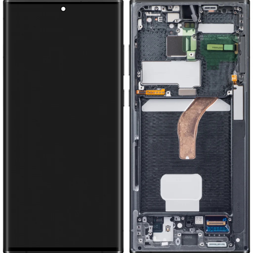 LCD kijelző modul Samsung Galaxy S22 Ultra 5G S908 - fekete. Eredeti pótalkatrész Samsung licenc alatt - eredeti szervizalkatrész. Kijelzőkerettel/alvázzal, oldalsó gombokkal és csengő/hangszóróval felszerelve.