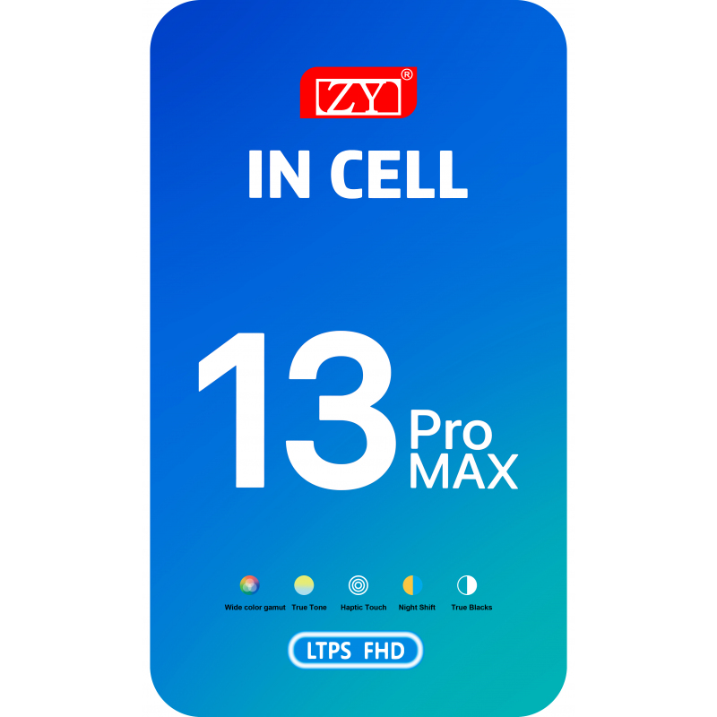 LCD kijelző modul ZY Apple iPhone 13 Pro Max - fekete. A ZY licenc alapján gyártott alkatrész a telefon hibás vagy sérült kijelzőjének cseréjére szolgál. Speciális szalaggal rendelkezik, amelyre az eredeti hibás kijelző IC-je kerül, így kiküszöbölve a nem eredeti kijelző hibáját, és biztosítva a TrueTone funkció megfelelő működését. Széles színskálával és alacsony energiafogyasztással rendelkezik. Tartalmaz keretet és ragasztót. Megjegyzés: Az LCD kijelző modul cseréje után a fényérzékelő nem fog működni.