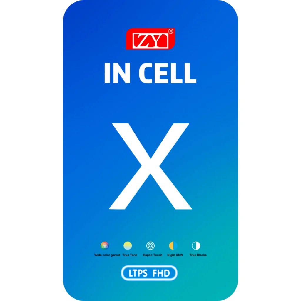 LCD kijelzőmodul ZY Apple iPhone X-hez - fekete. Tartalék alkatrész, amelyet a telefon hibás vagy sérült kijelzőjének cseréjére használnak. Különböző színválaszték és alacsony energiafogyasztás. Tartalmaz öntapadós kijelzőt.