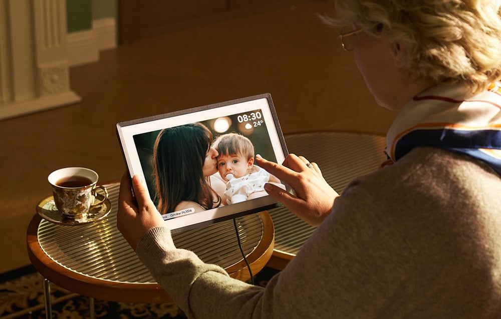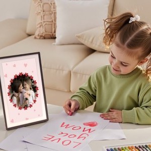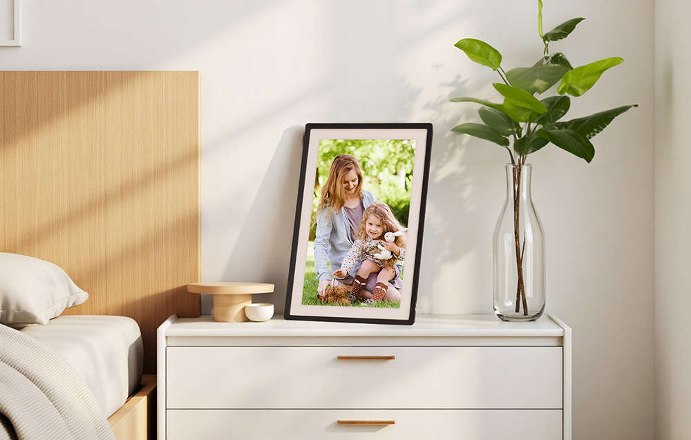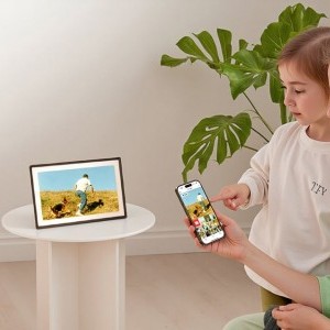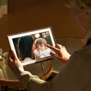 A keret automatikusan elforgatja a fényképeket, a tájolástól függően függőlegesen vagy vízszintesen jeleníti meg őket. Ezenkívül órát, időjárás-előrejelzést és alvó üzemmódot is kínál, amely a saját preferenciáihoz igazítható. A mágneses állvány stabil elhelyezést biztosít az asztallapon, a beépített tartó pedig lehetővé teszi a falra szerelést.