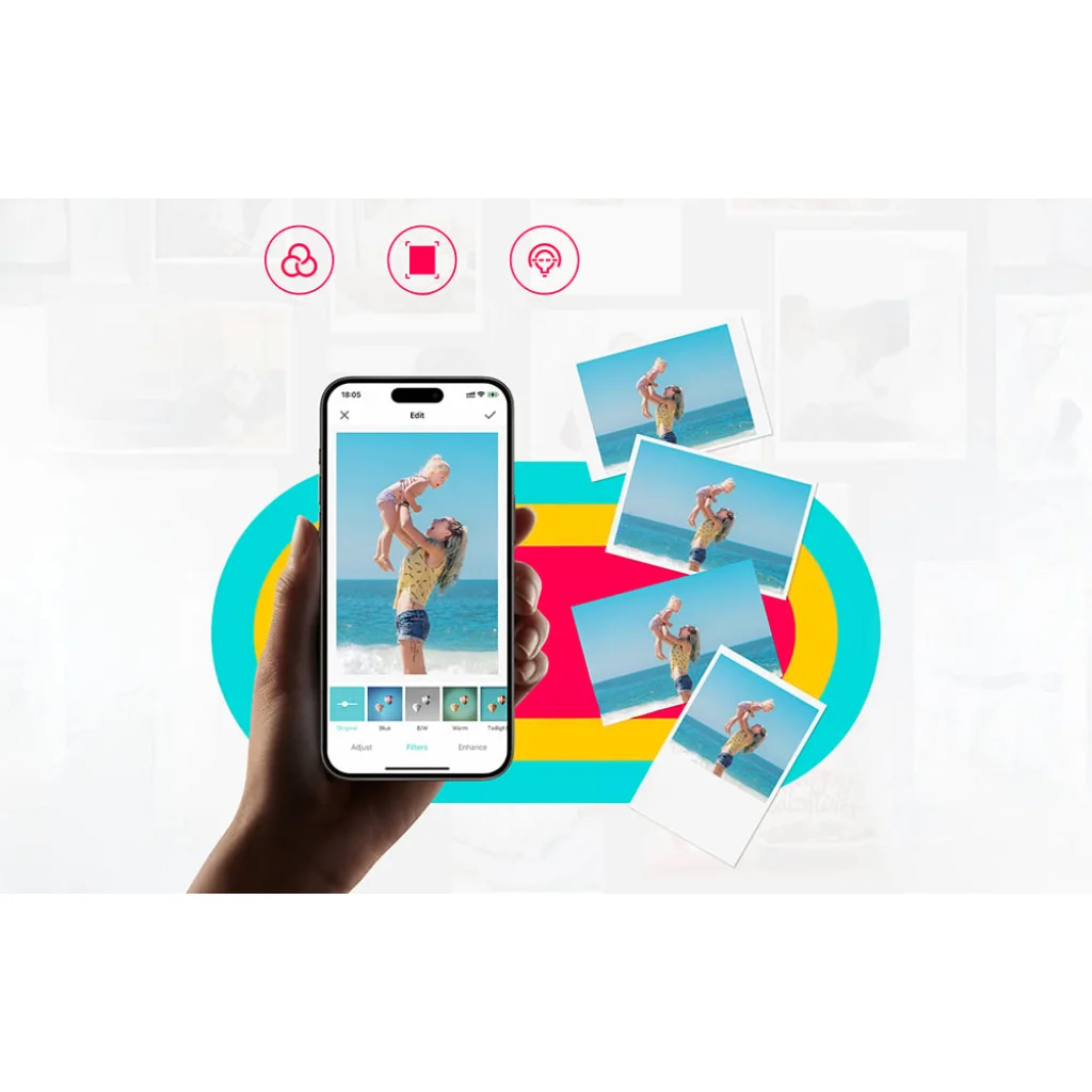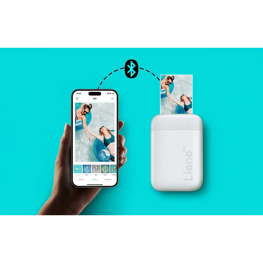 A nyomtató Bluetooth 5.0-n keresztül vezeték nélkül csatlakozik a telefonjához, így Wi-Fi nélkül is zökkenőmentesen működik. A telepítés rendkívül egyszerű – csak tegye be a papírt az oldalról, és kezdje el a nyomtatást. A Liene alkalmazással szűrőket, effektusokat, kereteket és nyomtatófej-tisztítási opciókat használhat, teljes formátumban, kerettel vagy keret nélkül, vagy négyzet alakban nyomtathat – mindezt a fénykép végső megjelenésének teljes ellenőrzése mellett.
