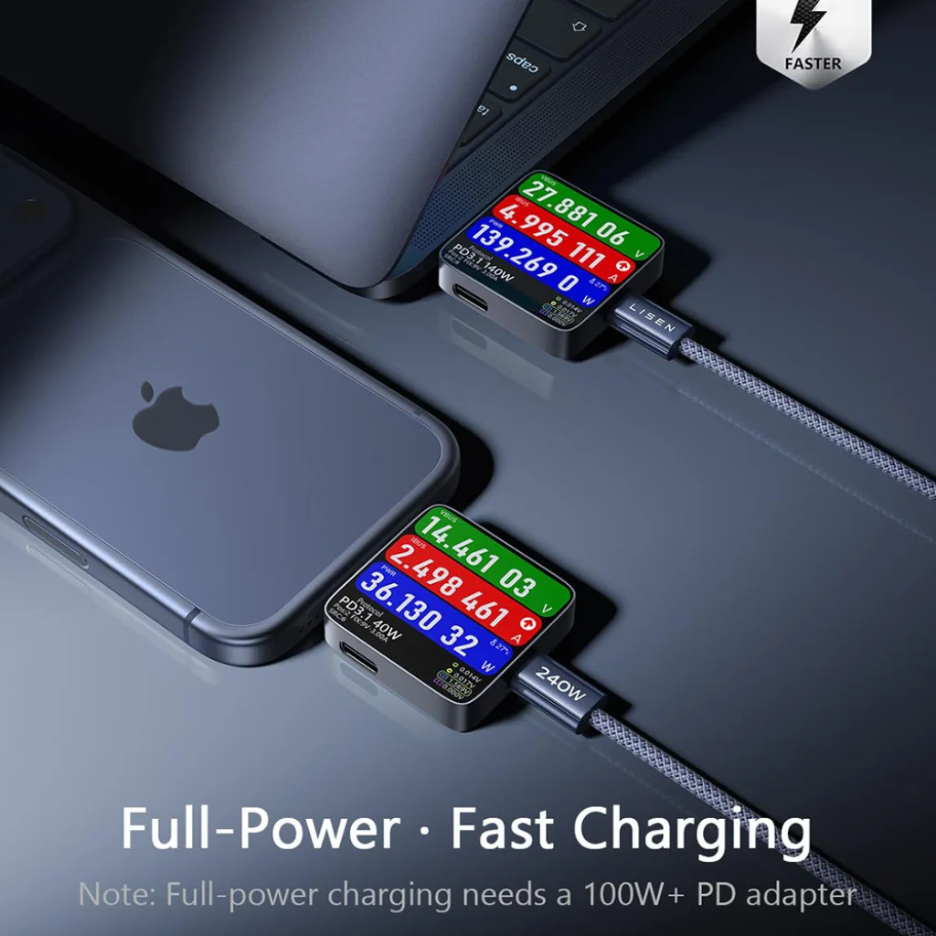 Élvezze a hihetetlenül gyors töltést a Lisen 240W-os USB-C kábelével. A "Turbo Charge" technológiának köszönhetően pillanatok alatt feltöltheti eszközeit, legyen szó akár nagyteljesítményű laptopról vagy okostelefonról. Ez a kábel a maximális teljesítményre tervezve, villámgyors energiaátvitelt biztosít, miközben folyamatosan ellenőrzi a biztonságos működést. Fontos megjegyzés: a teljes, 240W-os teljesítmény kihasználásához legalább 100W-os vagy nagyobb teljesítményű Power Delivery (PD) adapter szükséges.