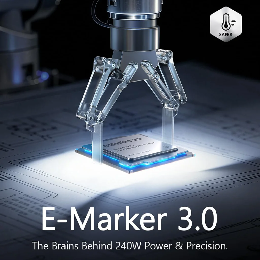 - E-Marker 3.0 chip: Ez az intelligens chip jelenti az agyat a 240W-os teljesítmény és precizitás mögött. Felelős a pontos és biztonságos energiaátvitelért, optimalizálja a töltési sebességet minden csatlakoztatott eszköz számára, miközben védelmet nyújt a túltöltés és túlmelegedés ellen. Ez a chip garantálja a biztonságos működést minden körülmények között.