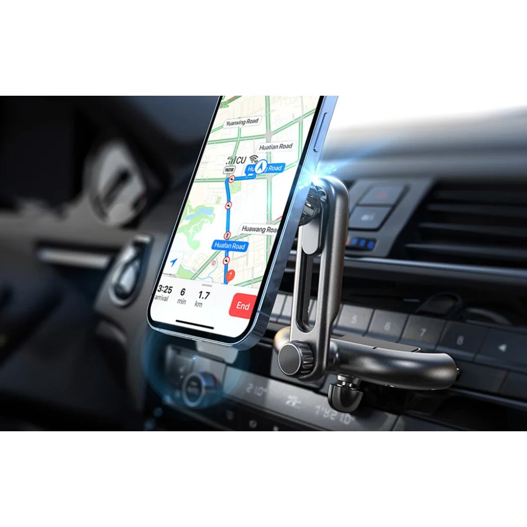 A tartó a legtöbb szellőzőnyíláshoz illeszkedik, így számos autóval kompatibilis. Sőt, vezetés közben sem akadályozza a láthatóságot. Ezen kívül állítható a magassága és a dőlésszöge – a fogantyú karja 360°-ban elfordul, így az igényeinek megfelelően állíthatja be.