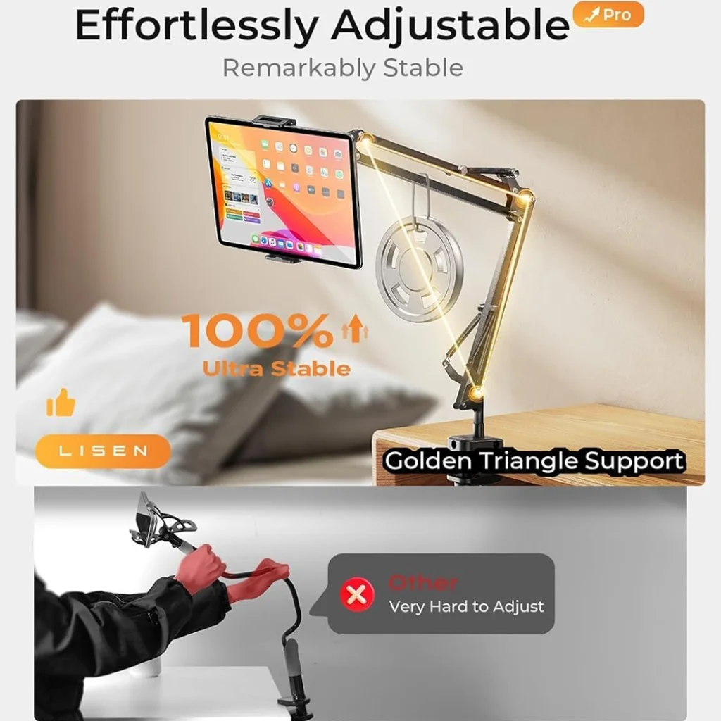 Élvezze a páratlan szabadságot az eszközök elhelyezésében. A Lisen tartó fejlett, 10-szer rugalmasabb állíthatósági mechanizmussal rendelkezik, amely lehetővé teszi, hogy bármilyen szögből optimálisan lássa kijelzőjét. A 360°-ban forgatható fej segítségével könnyedén válthat álló és fekvő nézet között, pillanatok alatt beállítva az ideális pozíciót a videóhívásokhoz, filmnézéshez vagy munkához.