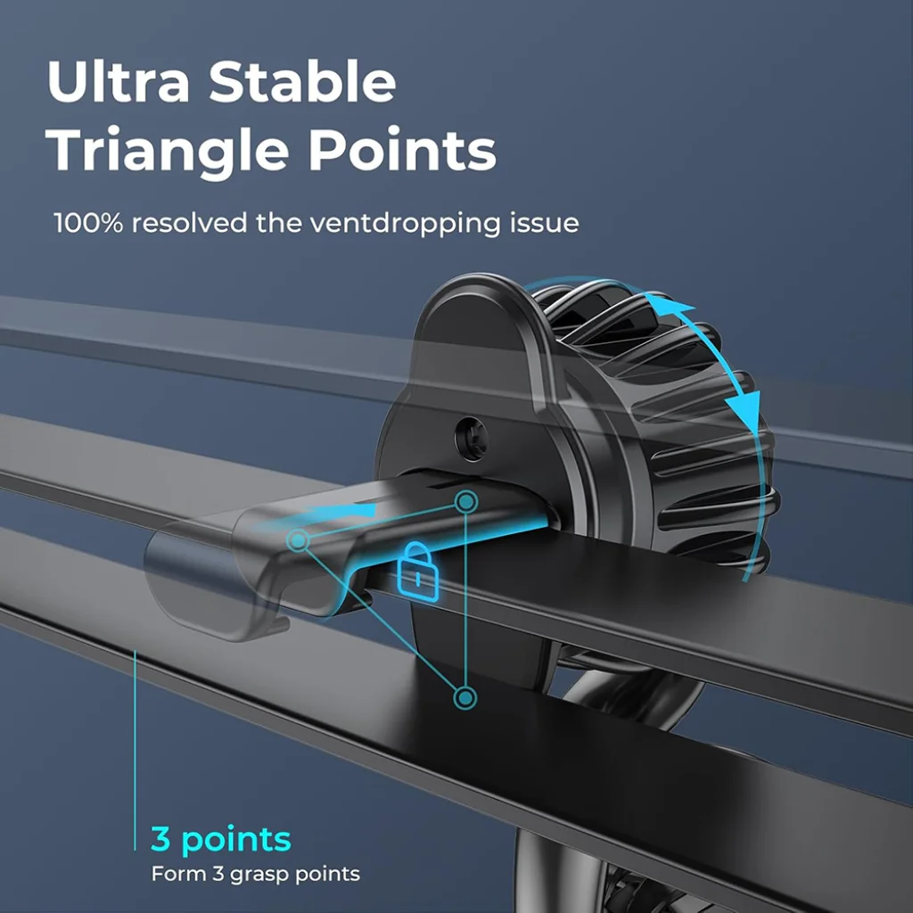 • 100% stabil, kampós rögzítés: Az egyedi, továbbfejlesztett kampós klipsz mechanizmus puha szilikon bevonattal biztosítja a szellőzőrácsba való hibátlan illeszkedést. A hárompontos rögzítés (Ultra Stable Triangle Points) 100%-ban megoldja a tartó leesésének problémáját, így készüléke mindig a helyén marad.
