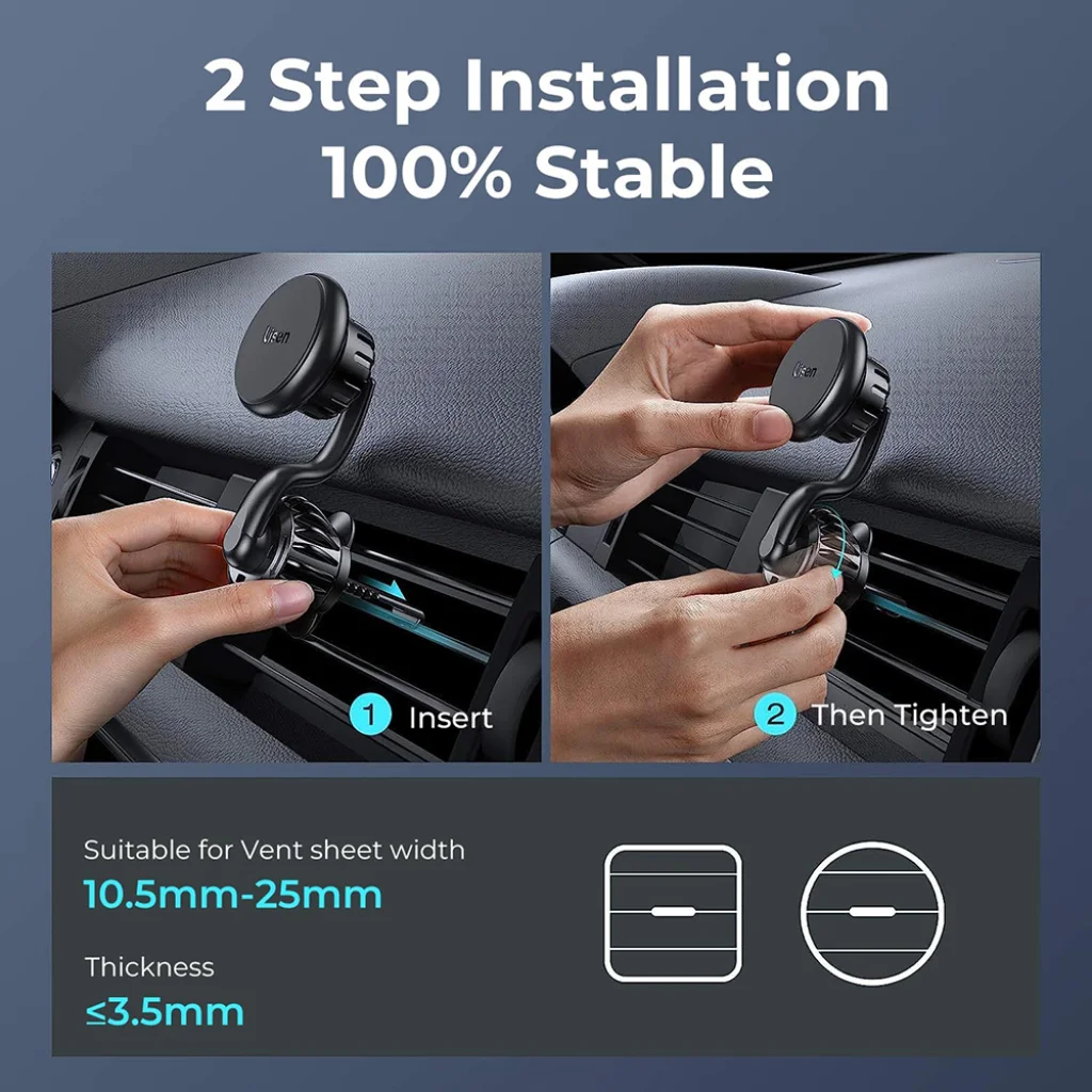 • Nem takarja el a szellőzőnyílást: A Lisen innovatív kialakításának köszönhetően a telefonja a szellőzőnyílás alatt helyezkedik el, így a légáramlás zavartalan marad. Élvezze a folyamatos hűtést vagy fűtést anélkül, hogy a tartó blokkolná a légbefúvást.
