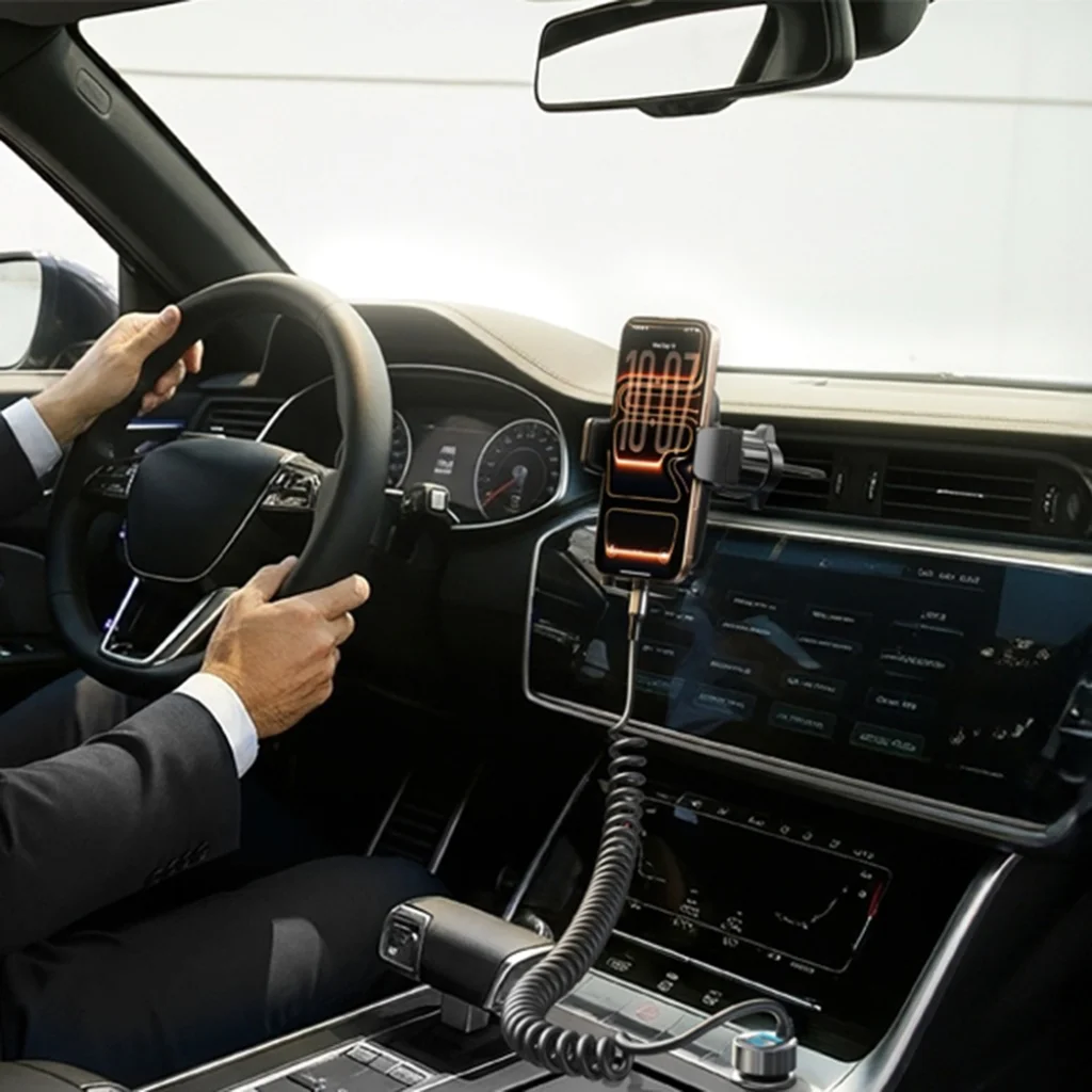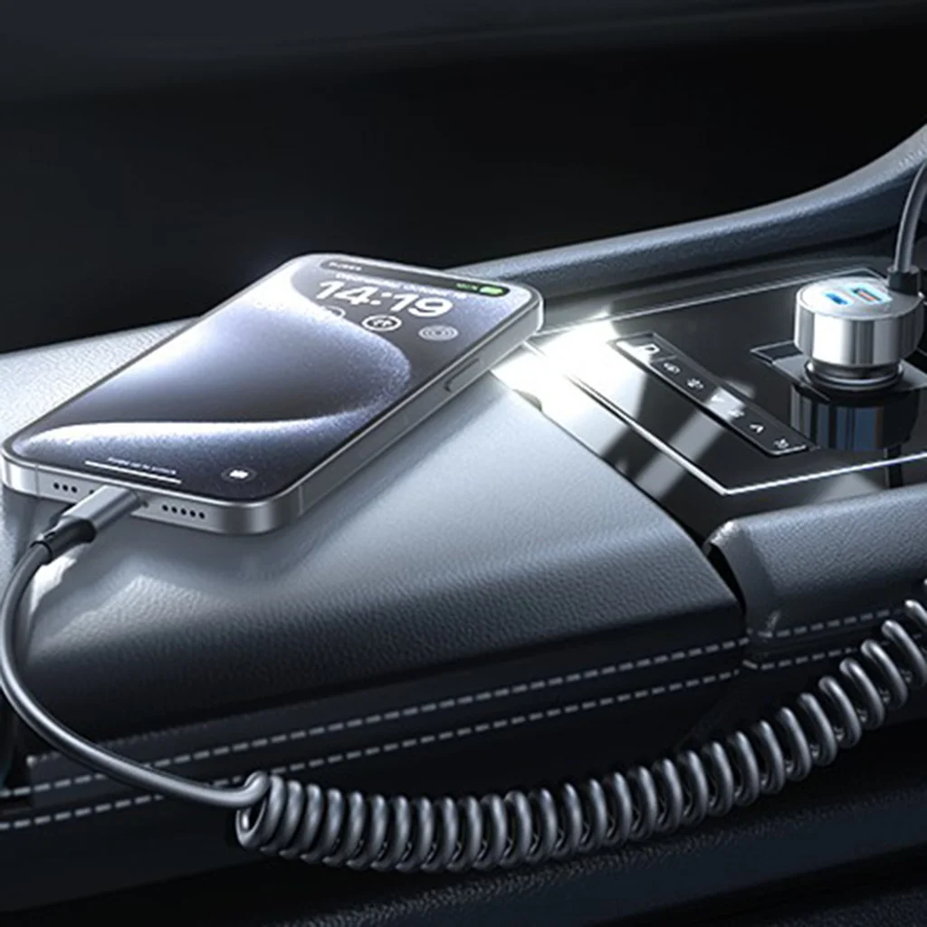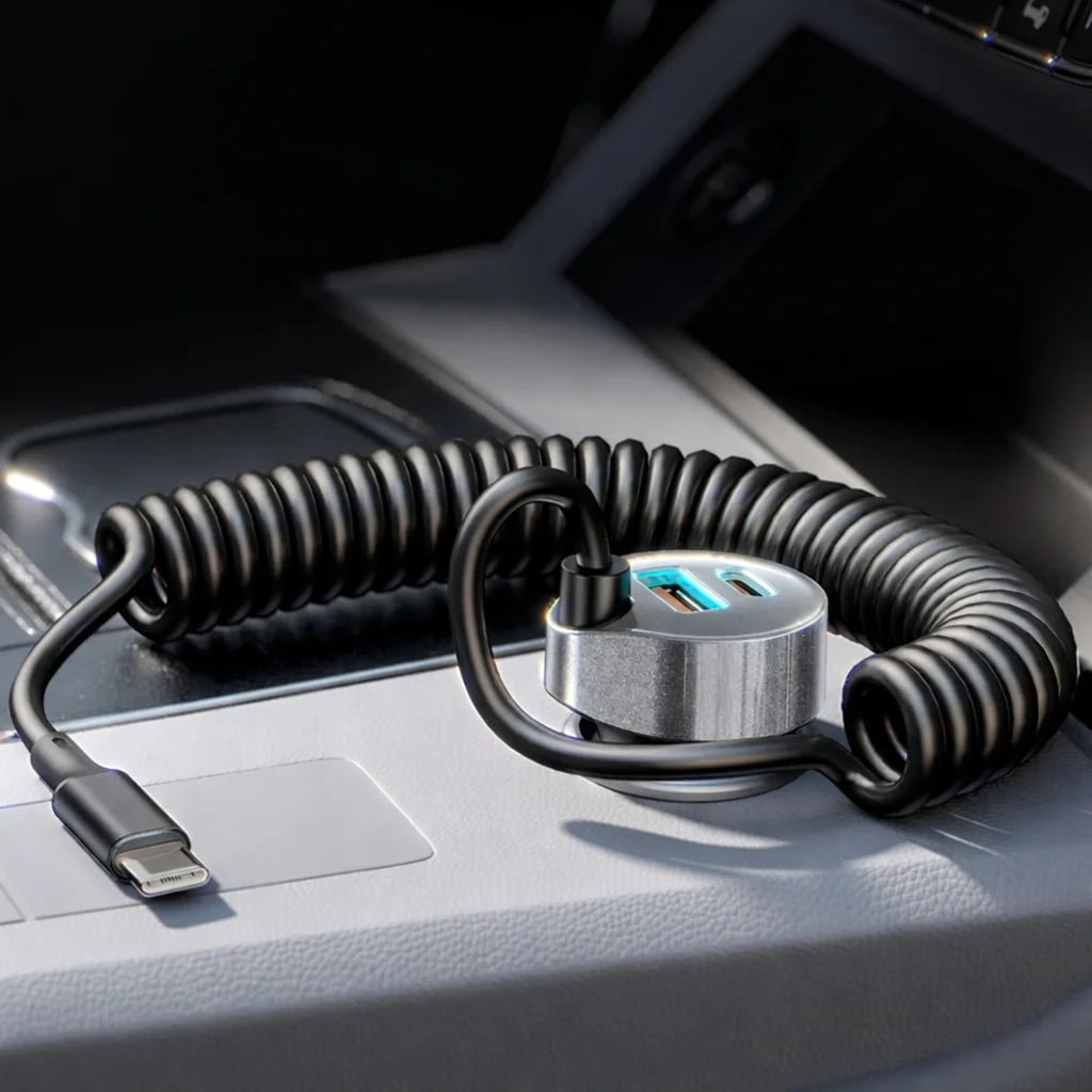 A töltő egyik legkiemelkedőbb tulajdonsága a beépített Type-C spirálkábel. Ez a zseniális megoldás megszünteti a gubancolódó kábelek problémáját. A kábel tökéletesen nyúlik, ha szüksége van rá, majd szépen visszahúzódik eredeti formájába, rendet és tisztaságot tartva az autóban. Ideális a központi konzolon elhelyezett vagy műszerfalra rögzített telefonok töltéséhez.