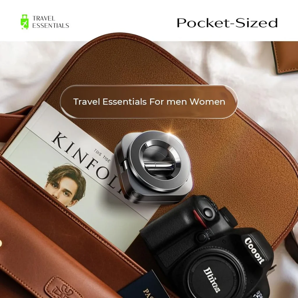• Kompakt és utazóbarát kialakítás: "Pocket-Sized" és "Travel Essentials" – ahogy a képek is mutatják, a tartó összecsukható kialakítása rendkívül helytakarékos, így könnyedén elfér táskádban vagy zsebedben. Tökéletes társad lesz utazásaid során, bárhová is indulsz.