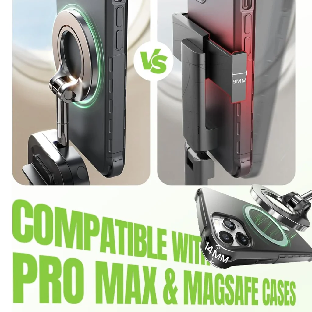 • Mágneses stabilitás és széles körű kompatibilitás: Az erős mágneses rögzítés – mint látható, MagSafe tokokkal és iPhone Pro Max modellekkel is – biztosítja, hogy telefonod stabilan a helyén maradjon, még rázósabb utakon vagy intenzív mozgás közben is. A modern, gyűrűs kialakítás megbízható tartást garantál a készülékednek.