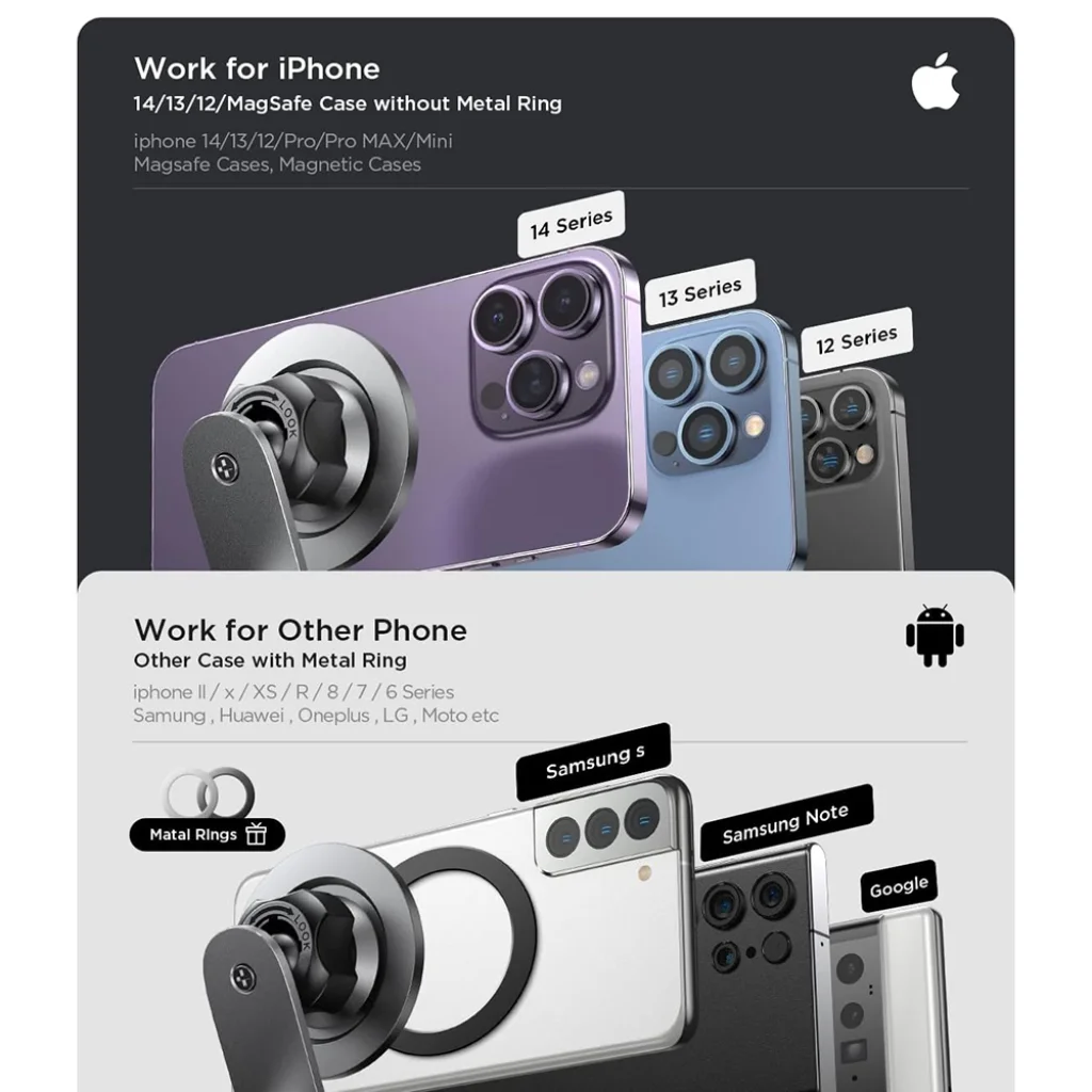 • Egyéb telefonok és tokok (pl. Samsung, Huawei, OnePlus, LG, Moto, régebbi iPhone modellek): A mellékelt fémgyűrűk segítségével bármilyen okostelefonhoz vagy tokhoz rögzíthető, biztosítva a széleskörű használhatóságot.