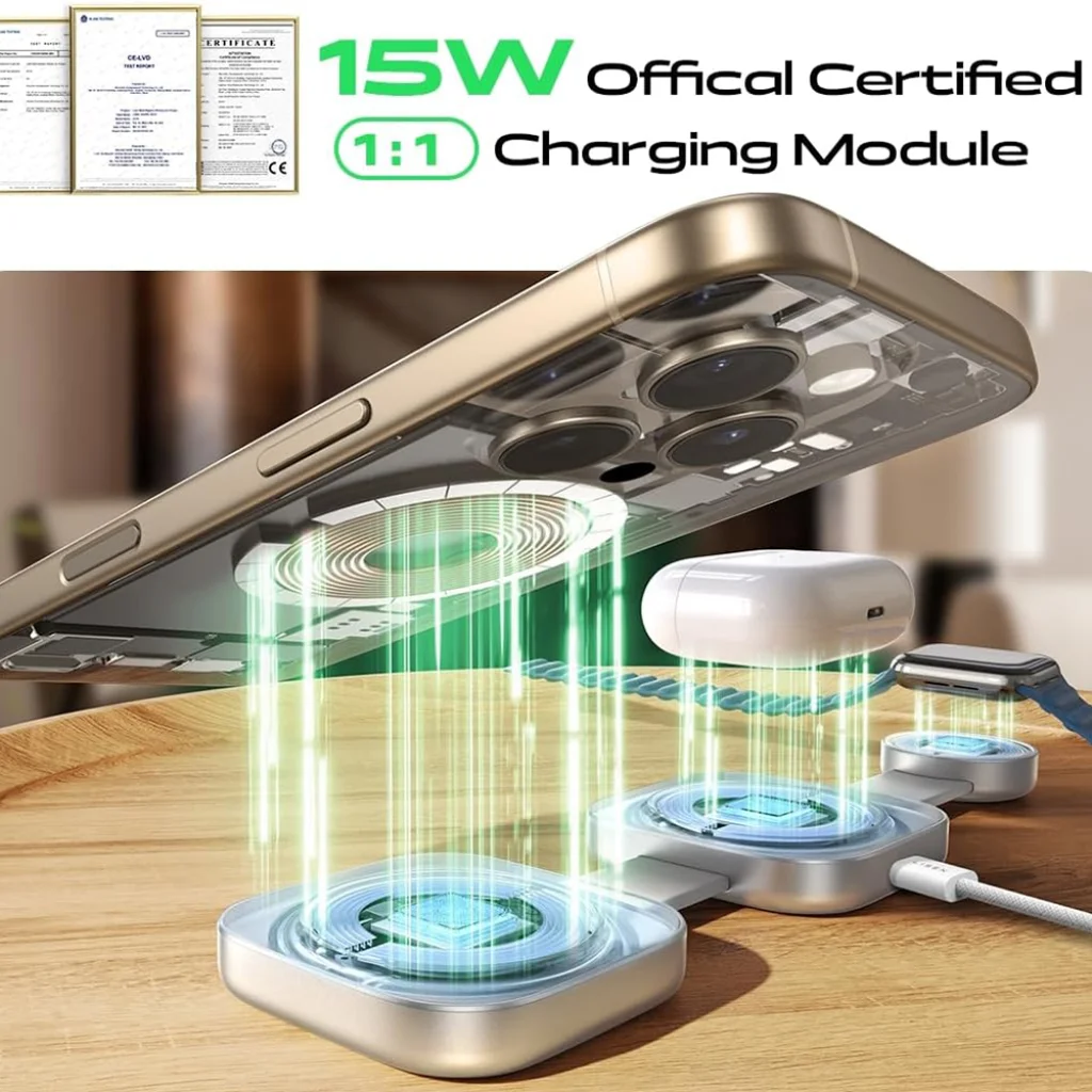 • 3 az 1-ben vezeték nélküli töltés: Töltse iPhone-ját, AirPods-át és Apple Watch-át egyszerre, rendszerezett és kábelmentes környezetben.