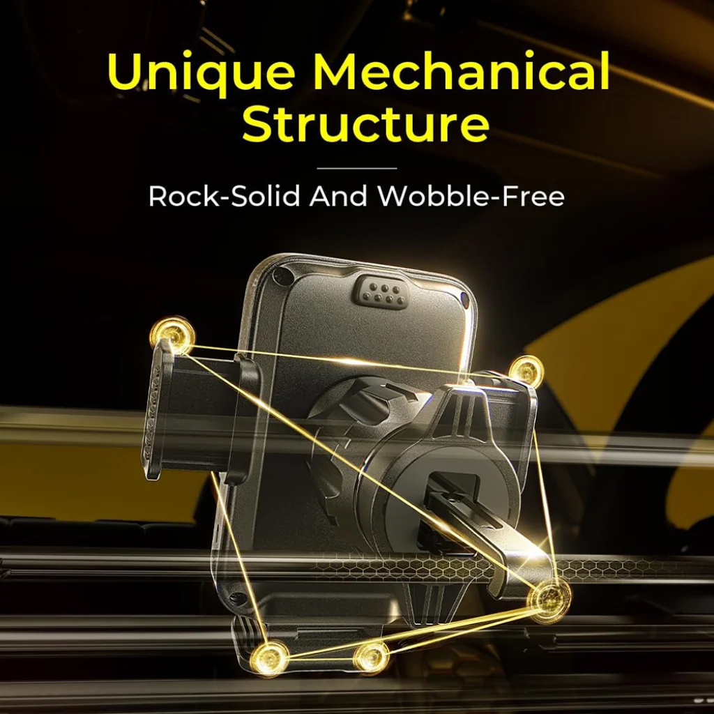 - A telefon rögzítése kettős mechanizmussal történik: erős mágneses rögzítés és stabil befogó karok a kiemelkedő biztonságért.